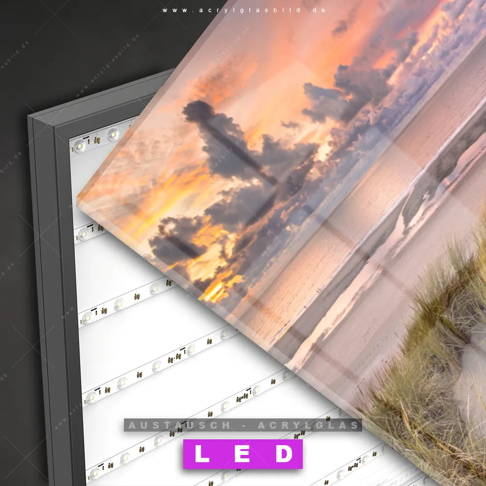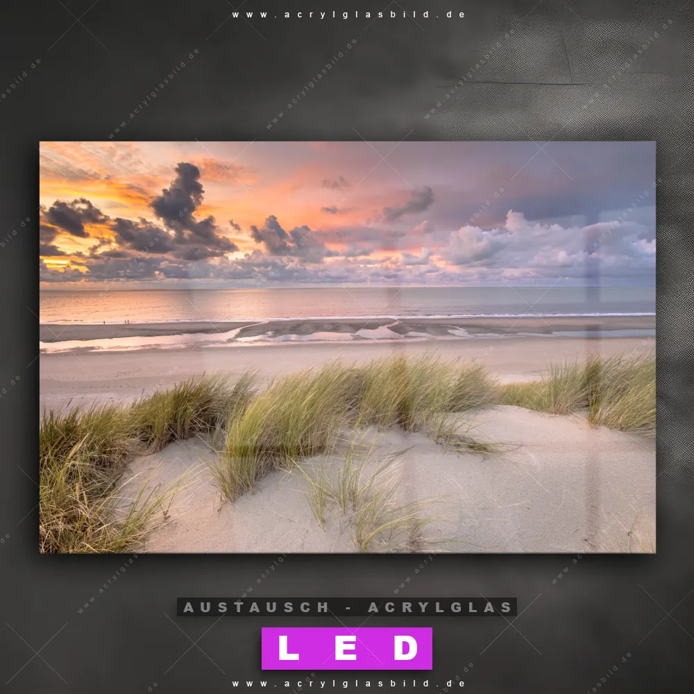 Begriffe wie Sommer, Deutschland, Dünen, Gräser, Ostsee - Nordsee, Urlaub - Reisen, Sonnenuntergang - Sonnenaufgang haben dich auf der Suche nach deinem neuen Austausch-Acrylglasbild inspiriert? Dann sollte das Wechsel-Acrylglasbild Sanddünen Deutschland für dein bereits vorhandenes LED Acrylglasbild Canvalight® DIA den Weg zu dir finden.
