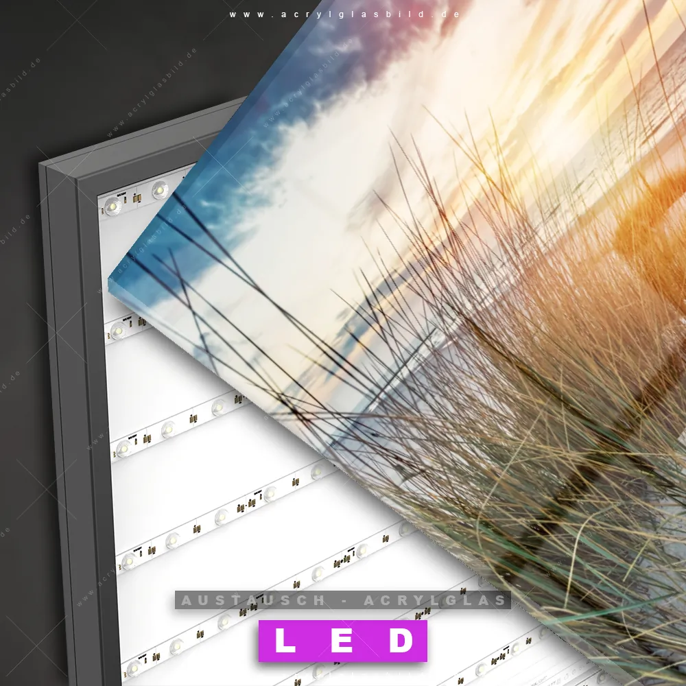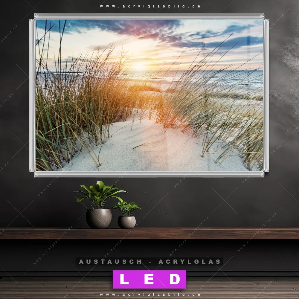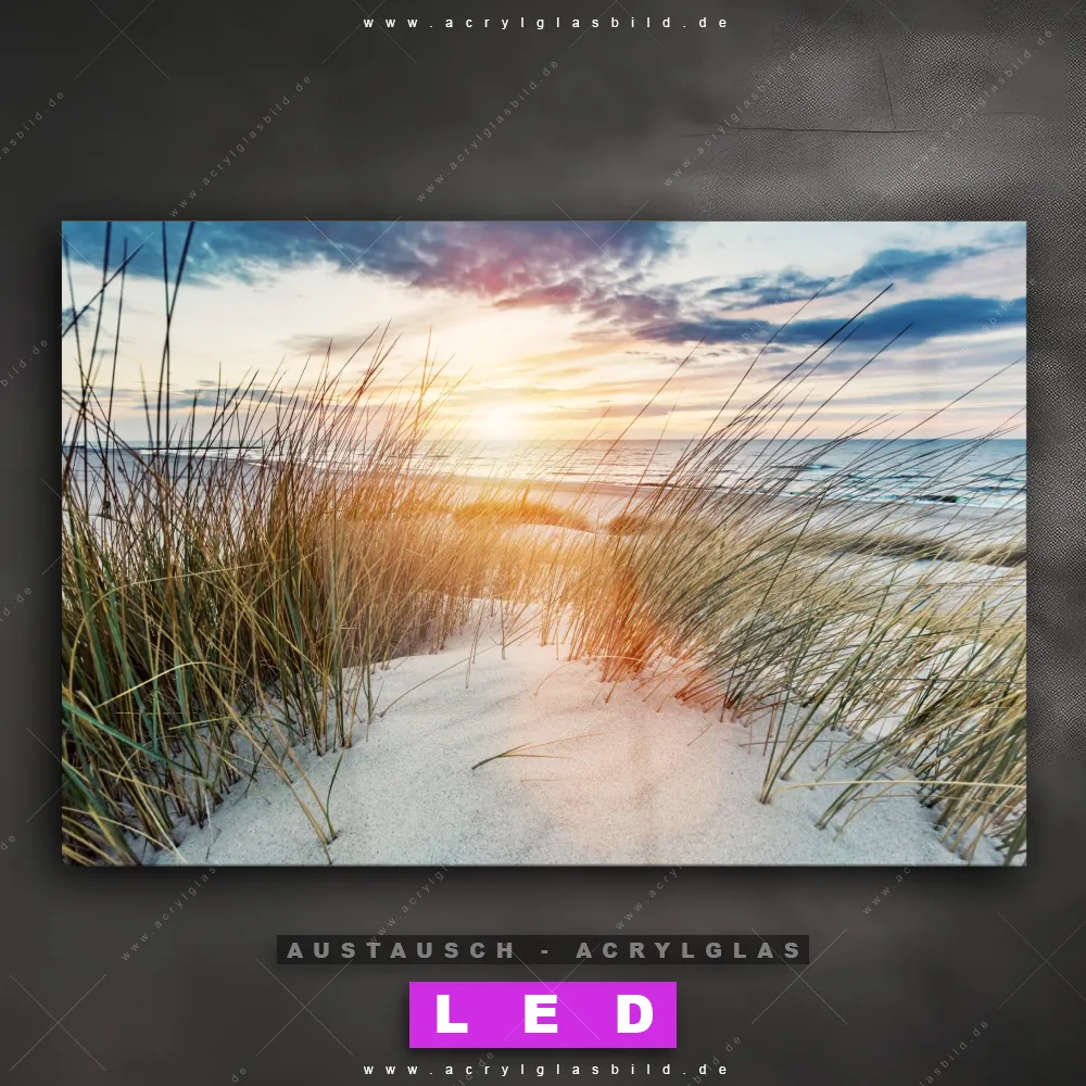 Begriffe wie Deutschland, Sommer, Ostsee - Nordsee, Urlaub - Reisen, Sonnenuntergang - Sonnenaufgang, Dünen, Gräser, Frühling haben dich auf der Suche nach deinem neuen Austausch-Acrylglasbild inspiriert? Dann sollte das Wechsel-Acrylglasbild Sonne hinter den Dünen für dein bereits vorhandenes LED Acrylglasbild Canvalight® DIA den Weg zu dir finden.