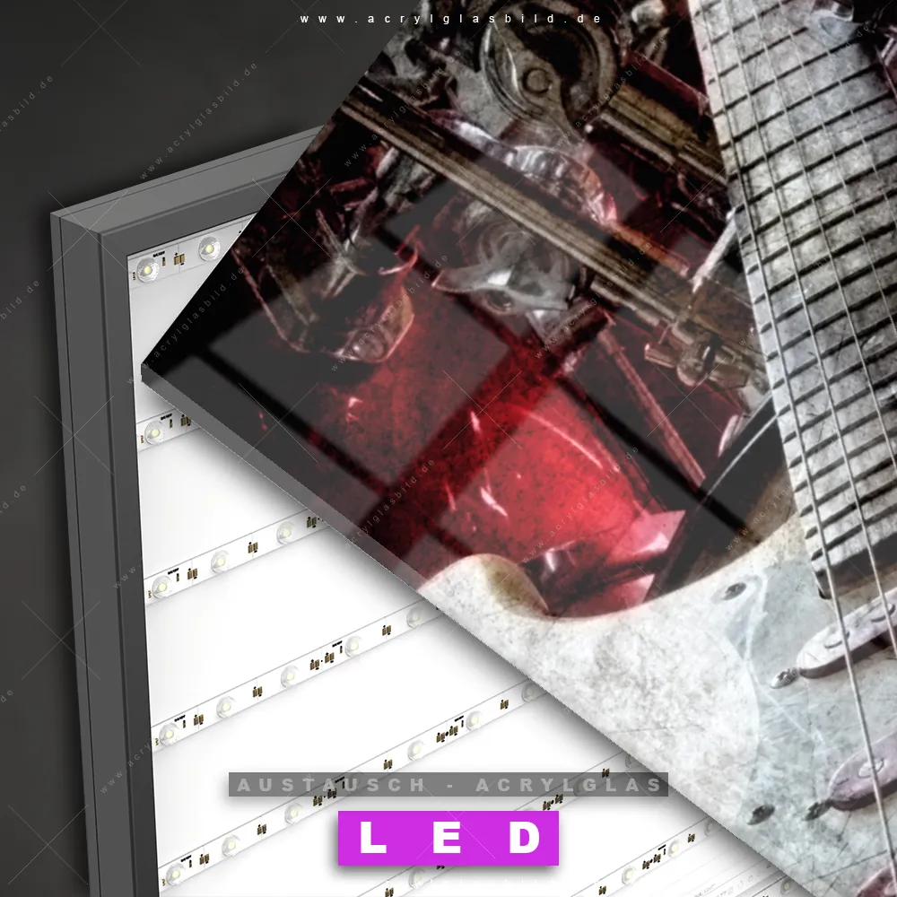 Begriffe wie Musik, Gitarre, Instrument, Strom, Elektrizität haben dich auf der Suche nach deinem neuen Austausch-Acrylglasbild inspiriert? Dann sollte das Wechsel-Acrylglasbild E-Gitarre antik für dein bereits vorhandenes LED Acrylglasbild Canvalight® DIA den Weg zu dir finden.