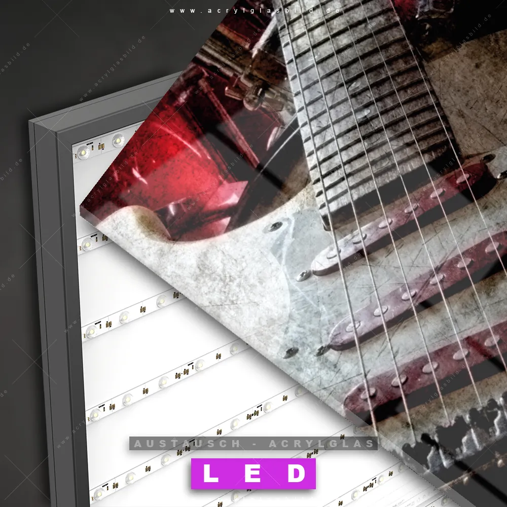 Begriffe wie Musik, Gitarre, Instrument, Strom, Elektrizität haben dich auf der Suche nach deinem neuen Austausch-Acrylglasbild inspiriert? Dann sollte das Wechsel-Acrylglasbild E-Gitarre antik für dein bereits vorhandenes LED Acrylglasbild Canvalight® DIA den Weg zu dir finden.