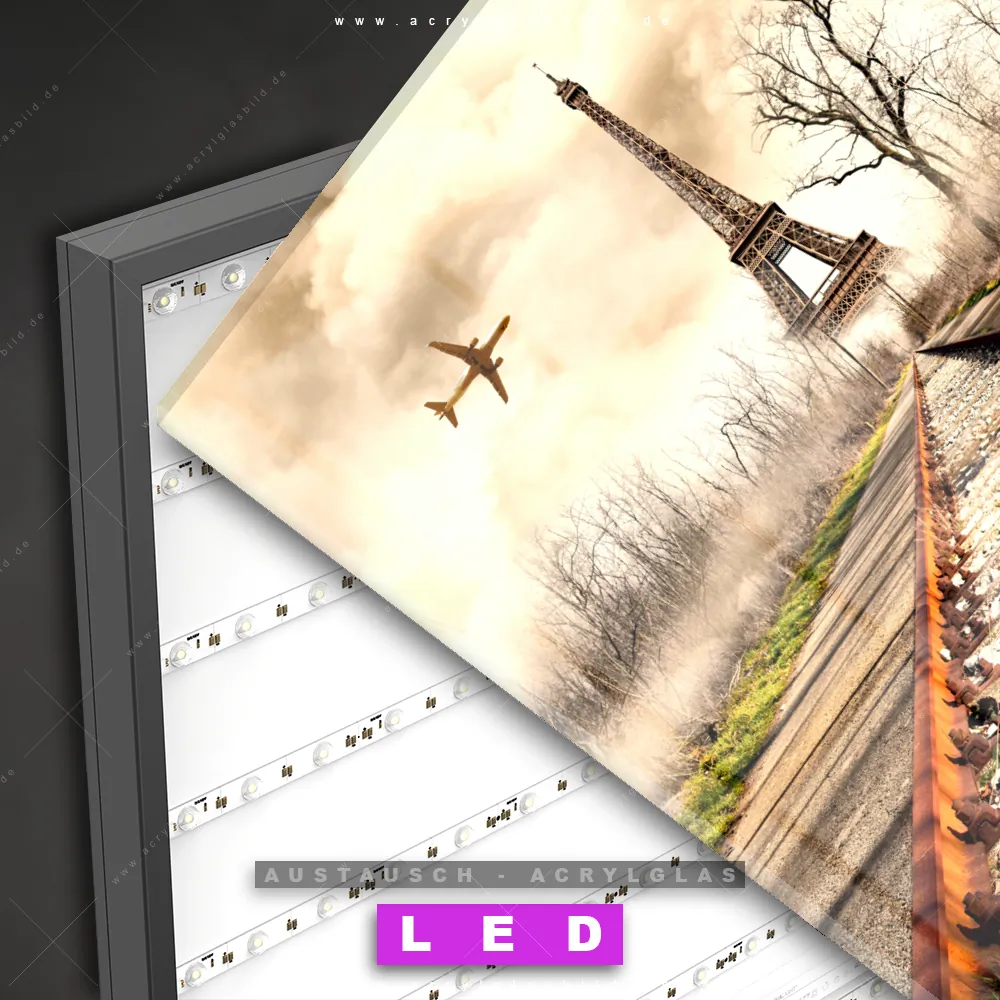 Begriffe wie Mixed Media, Sehenswürdigkeiten, Frankreich, Paris, Eifelturm, Landschaft, Bahngleis, Gleis, Flugzeug haben dich auf der Suche nach deinem neuen Austausch-Acrylglasbild inspiriert? Dann sollte das Wechsel-Acrylglasbild Eiffelturm am Gleisende für dein bereits vorhandenes LED Acrylglasbild Canvalight® DIA den Weg zu dir finden.