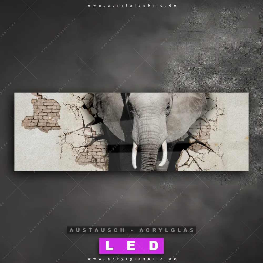 Begriffe wie Elefant, Afrika, Safari, Mauer, Durchbruch, Stärke haben dich auf der Suche nach deinem neuen Austausch-Acrylglasbild inspiriert? Dann sollte das Wechsel-Acrylglasbild Elefant durchbricht Wand für dein bereits vorhandenes LED Acrylglasbild Canvalight® DIA den Weg zu dir finden.
