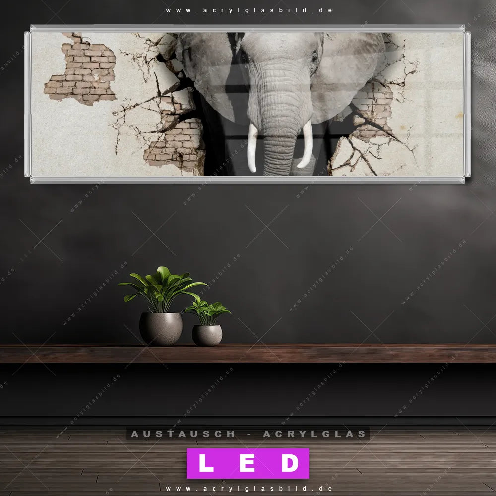 Wechsel-Acrylglas Canvalight® DIA | Elefant bricht durch Mauer | Panorama