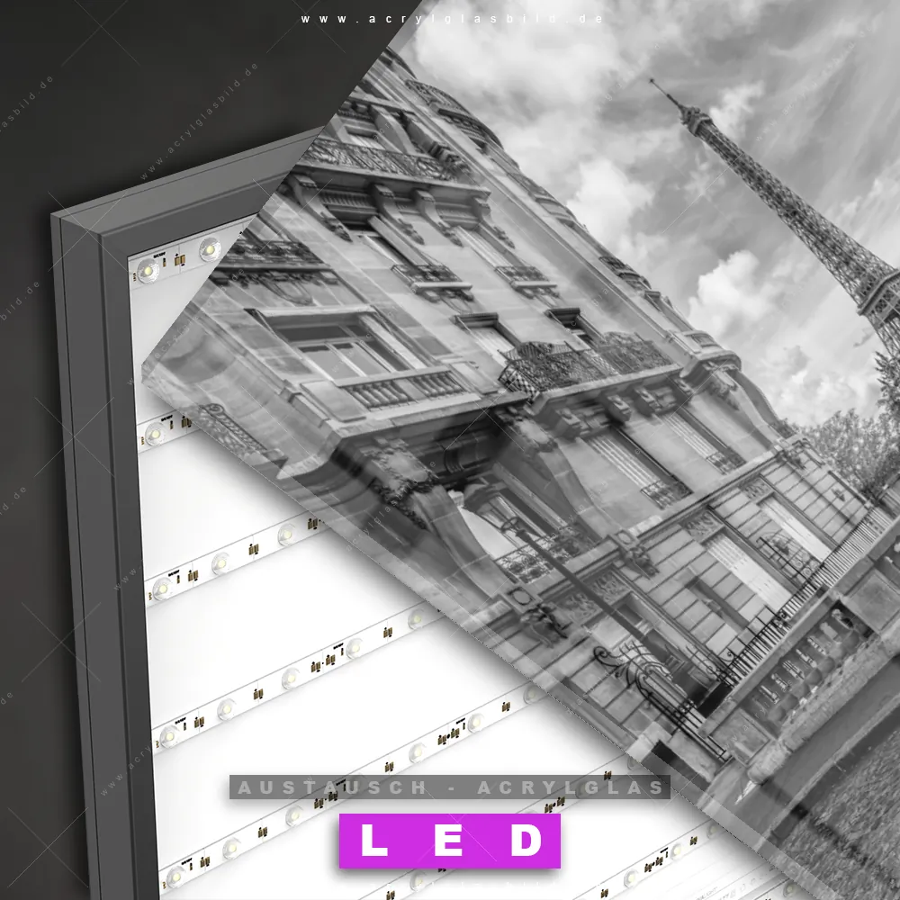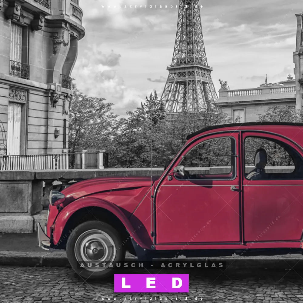 Begriffe wie Sehenswürdigkeiten, Frankreich, Paris, Eifelturm, Auto, Ente, Schwarzweiss, Eiffelturm, Oldtimer haben dich auf der Suche nach deinem neuen Austausch-Acrylglasbild inspiriert? Dann sollte das Wechsel-Acrylglasbild Oldtimer in Paris für dein bereits vorhandenes LED Acrylglasbild Canvalight® DIA den Weg zu dir finden.