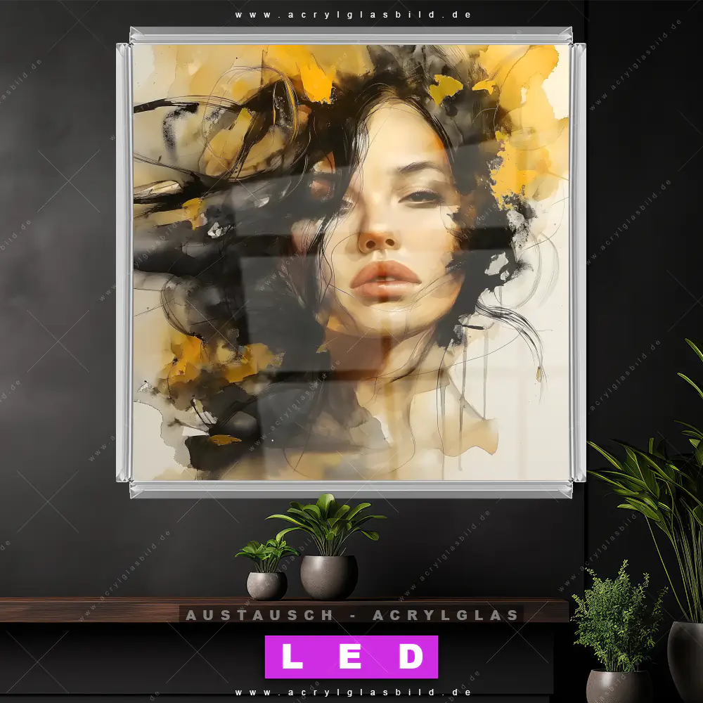 Begriffe wie Abstrakt, Modern, Kunst, Gemälde, Ölfarbe, Frau, Portrait, Lippen, Aquarell, Farbspritzer haben dich auf der Suche nach deinem neuen Austausch-Acrylglasbild inspiriert? Dann sollte das Wechsel-Acrylglasbild Abstrakte Schönheit in Gelb & Schwarz für dein bereits vorhandenes LED Acrylglasbild Canvalight® DIA den Weg zu dir finden.
