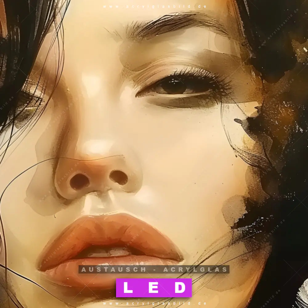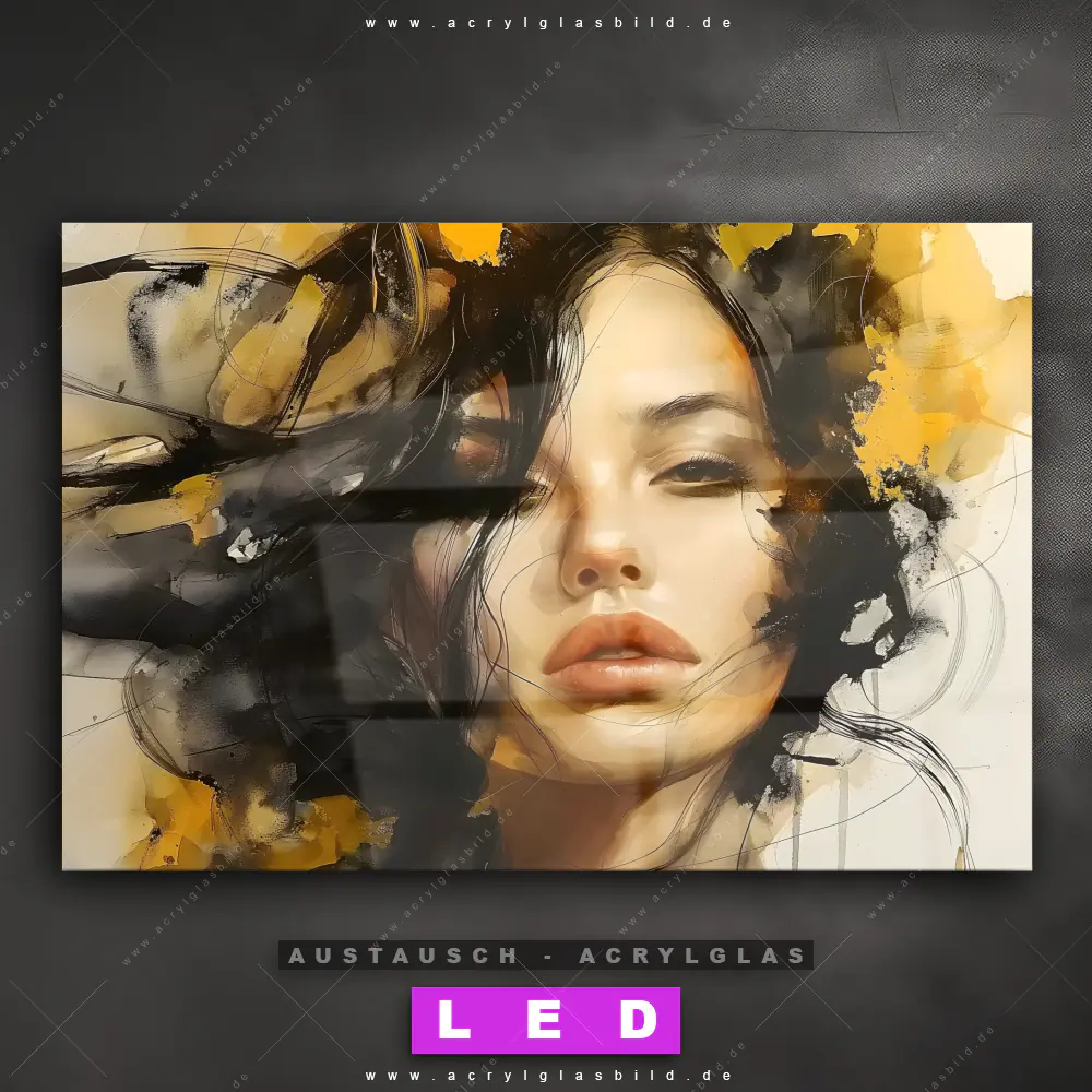 Begriffe wie Abstrakt, Modern, Kunst, Gemälde, Ölfarbe, Frau, Portrait, Lippen, Aquarell, Farbspritzer haben dich auf der Suche nach deinem neuen Austausch-Acrylglasbild inspiriert? Dann sollte das Wechsel-Acrylglasbild Abstrakte Schönheit in Gelb & Schwarz für dein bereits vorhandenes LED Acrylglasbild Canvalight® DIA den Weg zu dir finden.