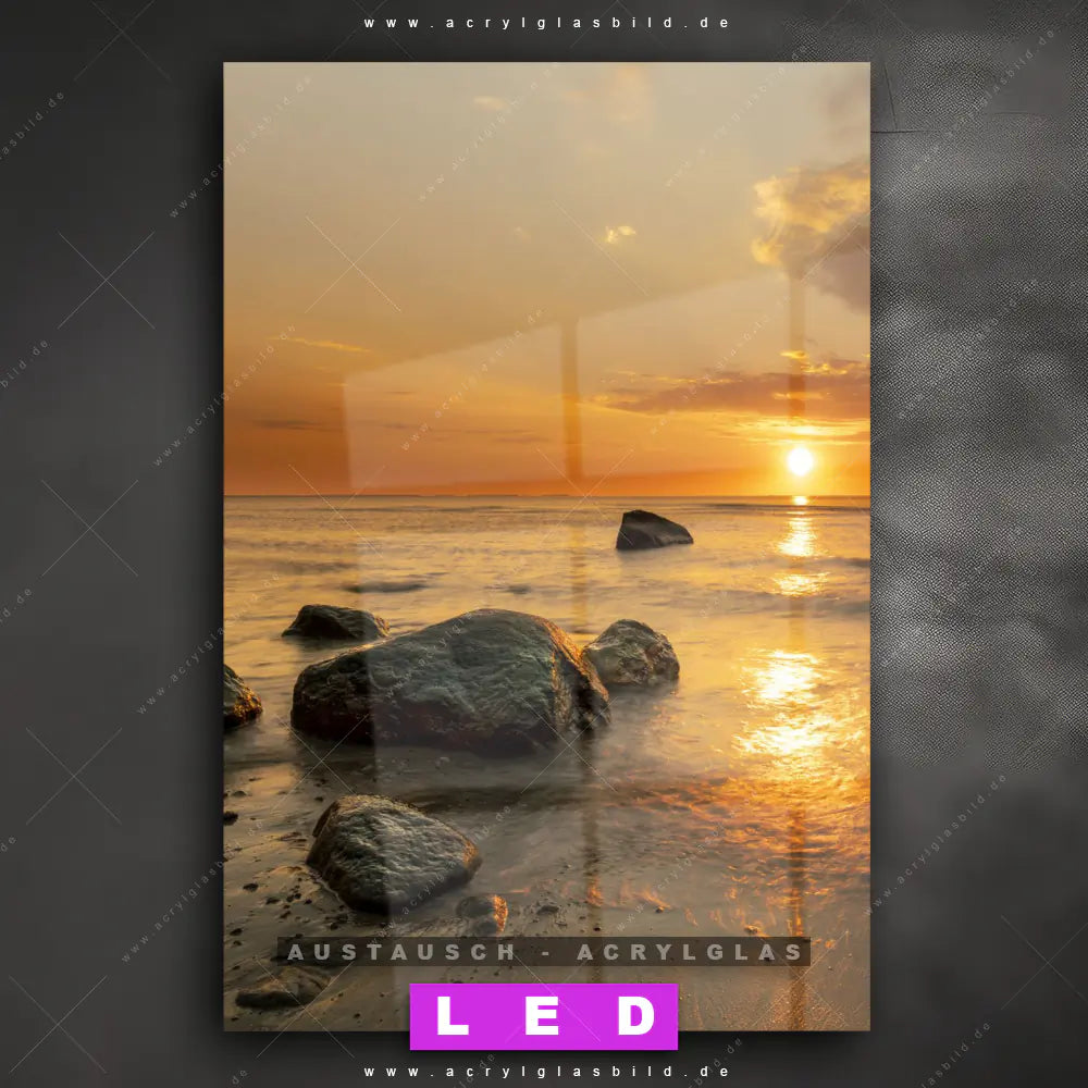 Begriffe wie Felsen, Sommer, Deutschland, Steine, Ostsee, Nordsee, Sonnenaufgang, Urlaub, Abenddämmerung haben dich auf der Suche nach deinem neuen Austausch-Acrylglasbild inspiriert? Dann sollte das Wechsel-Acrylglasbild Steine im Sonnenmeer für dein bereits vorhandenes LED Acrylglasbild Canvalight® DIA den Weg zu dir finden.