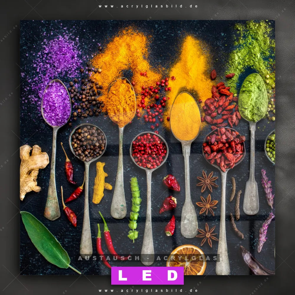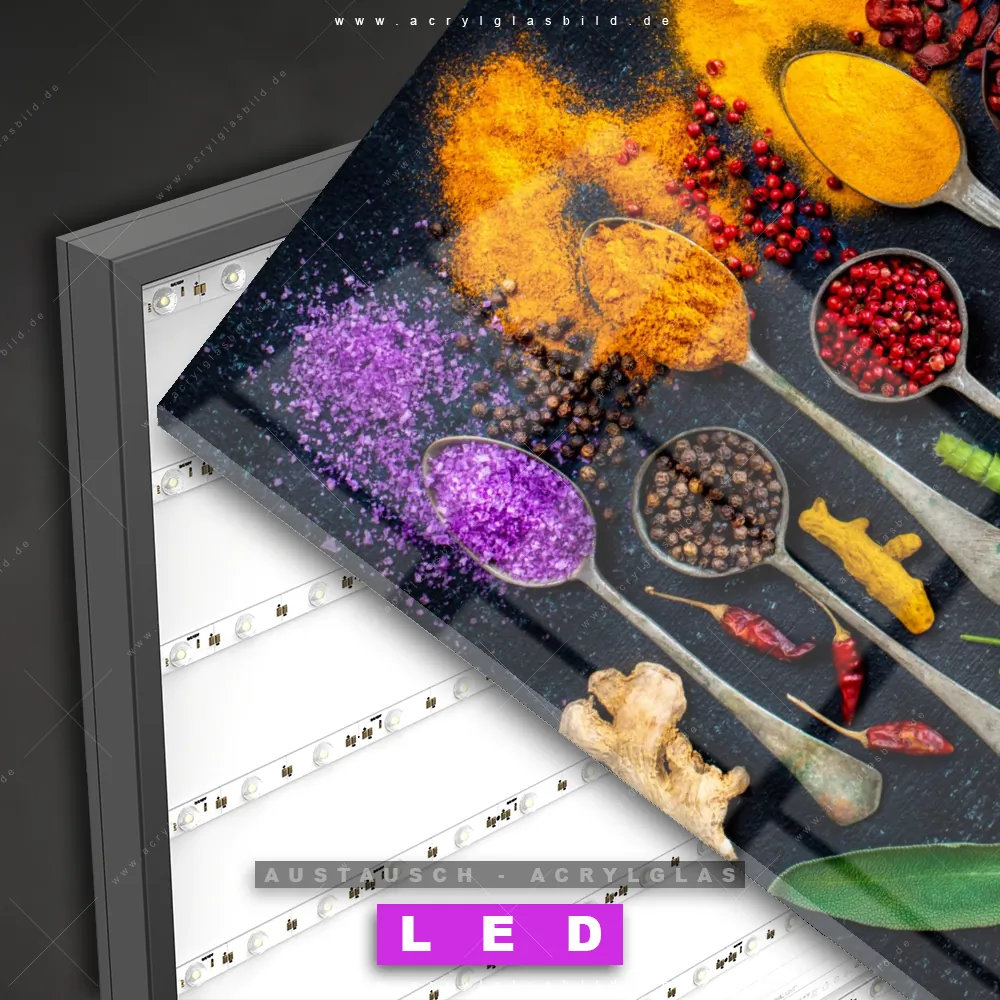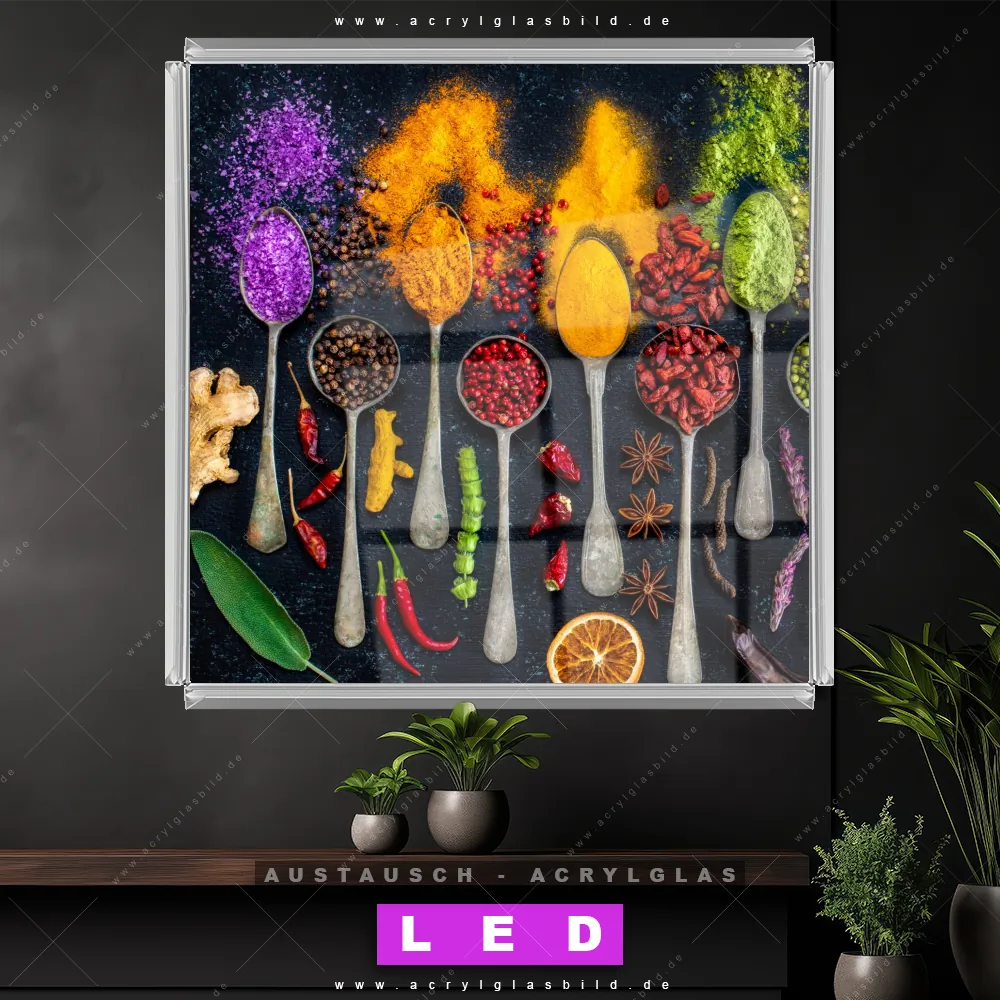 Begriffe wie Gewürze, Kräuter, Löffel, lecker, Pulver, Pfeffer, Chili, Besteck haben dich auf der Suche nach deinem neuen Austausch-Acrylglasbild inspiriert? Dann sollte das Wechsel-Acrylglasbild Besteck mit bunten Gewürzen für dein bereits vorhandenes LED Acrylglasbild Canvalight® DIA den Weg zu dir finden.