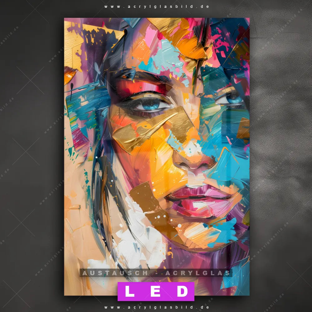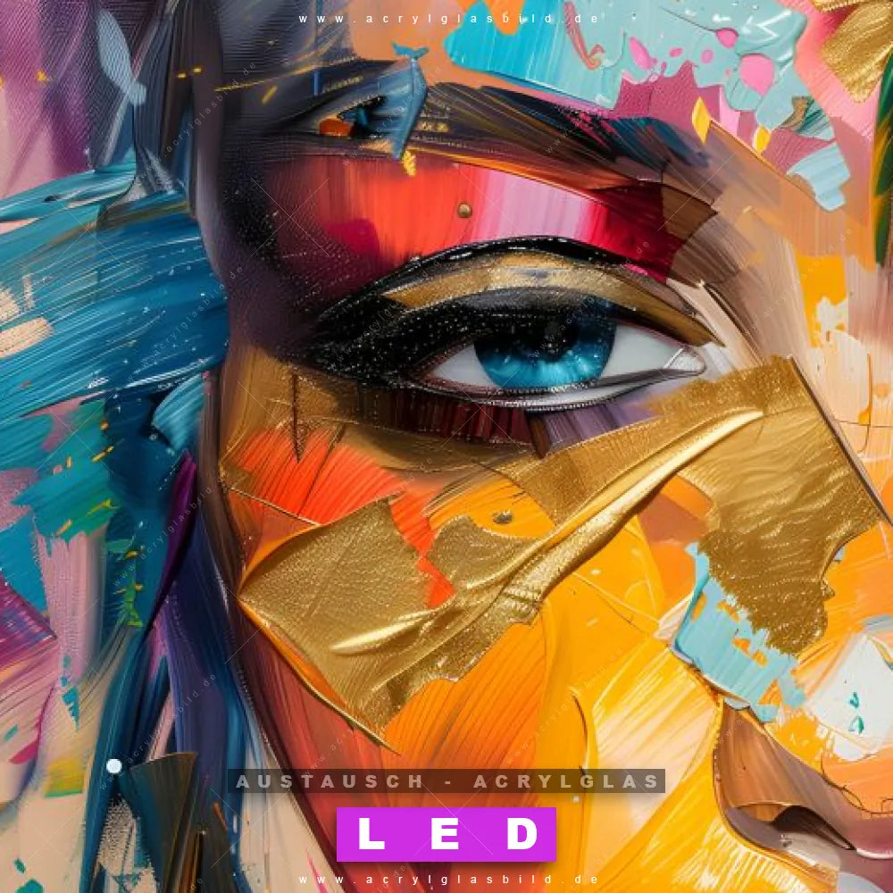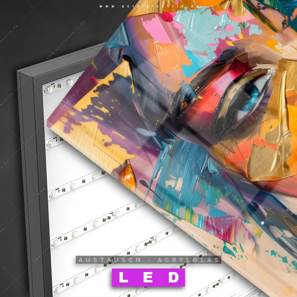 Begriffe wie Porträt, Frau, Gesicht, Farbexplosion, Farbspritzer, Frauenporträt haben dich auf der Suche nach deinem neuen Austausch-Acrylglasbild inspiriert? Dann sollte das Wechsel-Acrylglasbild Abstrakte Schönheit für dein bereits vorhandenes LED Acrylglasbild Canvalight® DIA den Weg zu dir finden.