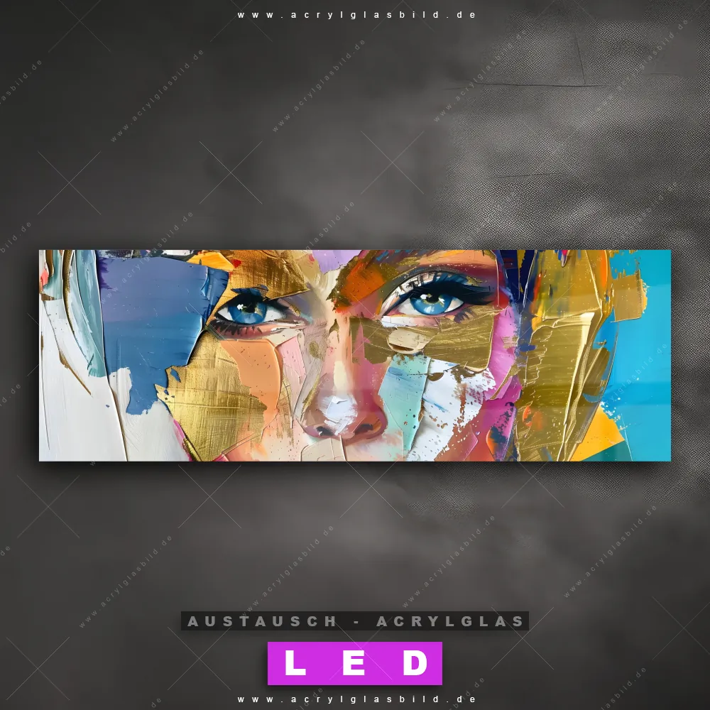 Begriffe wie Frauenporträt, Gesicht, Farbexplosion, Farbspritzer, Frau, Porträt haben dich auf der Suche nach deinem neuen Austausch-Acrylglasbild inspiriert? Dann sollte das Wechsel-Acrylglasbild Frauengesicht im abstrakten Stil für dein bereits vorhandenes LED Acrylglasbild Canvalight® DIA den Weg zu dir finden.
