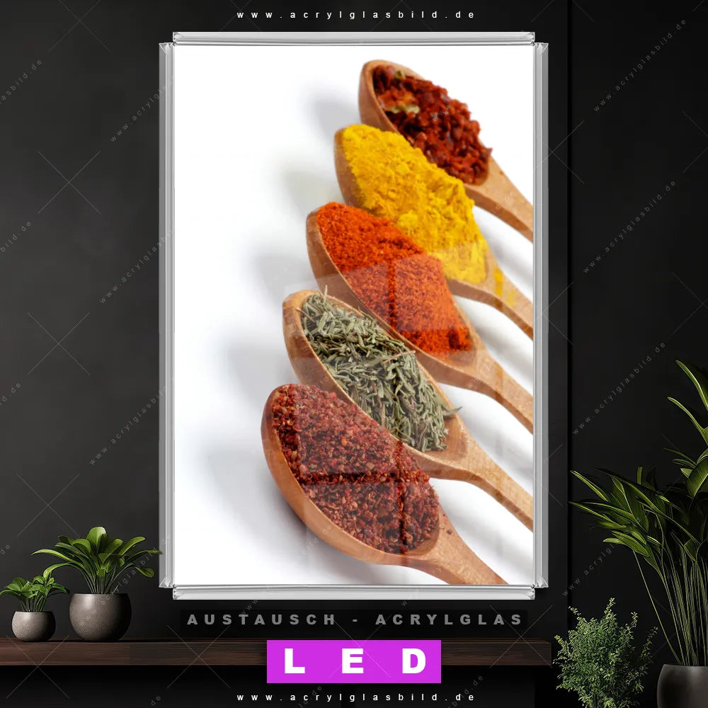 Begriffe wie Holzlöffel, Gewürze, Paprika, Curry, Chili, Thymian, Küche haben dich auf der Suche nach deinem neuen Austausch-Acrylglasbild inspiriert? Dann sollte das Wechsel-Acrylglasbild Bunte Gewürze auf Holzlöffeln für dein bereits vorhandenes LED Acrylglasbild Canvalight® DIA den Weg zu dir finden.
