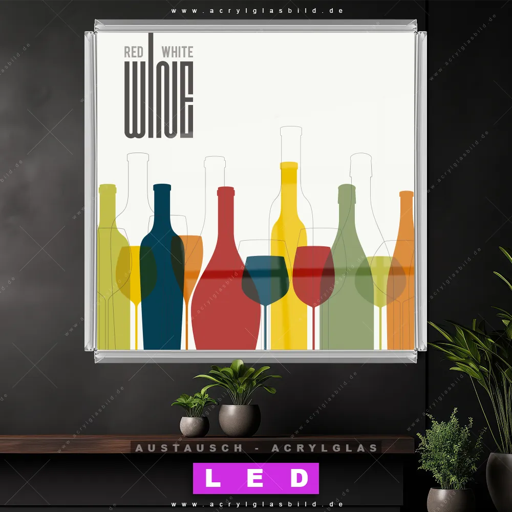 Begriffe wie Küche, Wein, Gläser, genießen, Alkohol, Rotwein, Flaschen, modern, Cocktailkirsche, Sekt, Martinigläser, Obst haben dich auf der Suche nach deinem neuen Austausch-Acrylglasbild inspiriert? Dann sollte das Wechsel-Acrylglasbild Weinflaschen und Weingläser für dein bereits vorhandenes LED Acrylglasbild Canvalight® DIA den Weg zu dir finden.