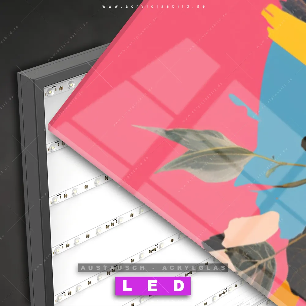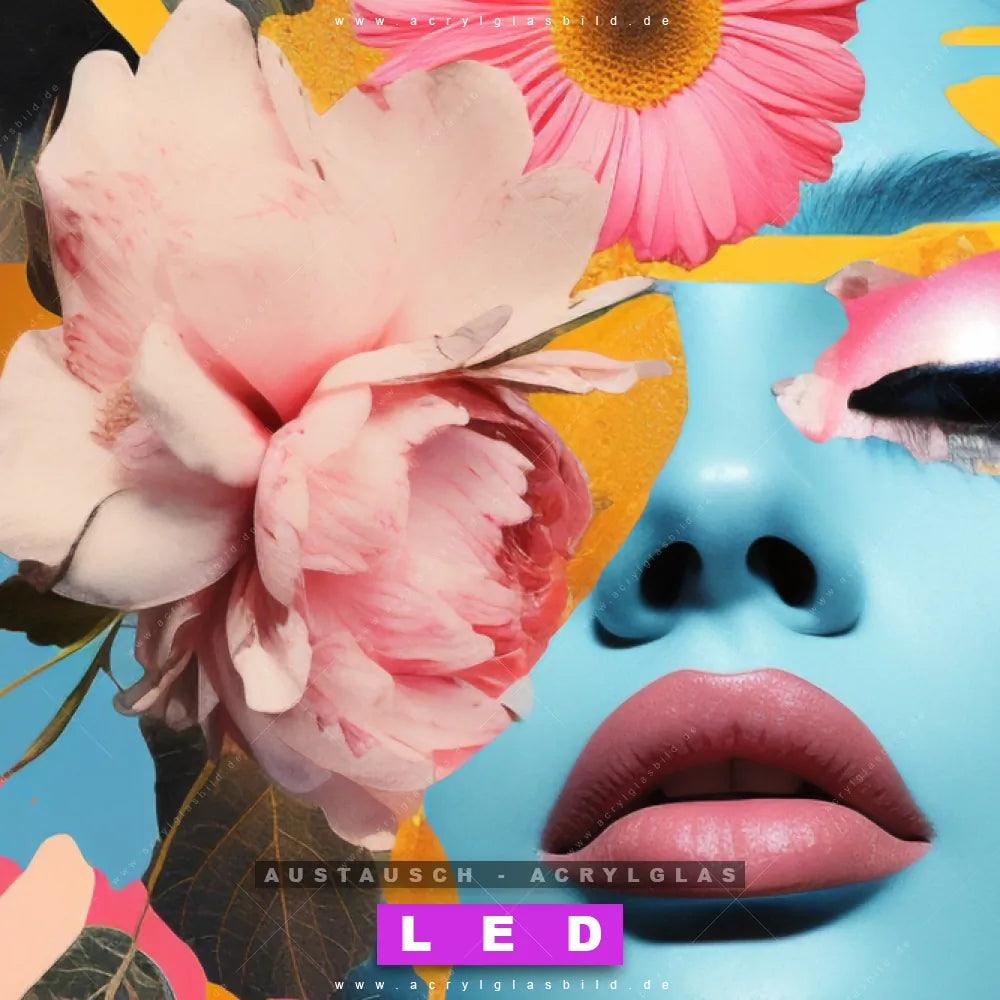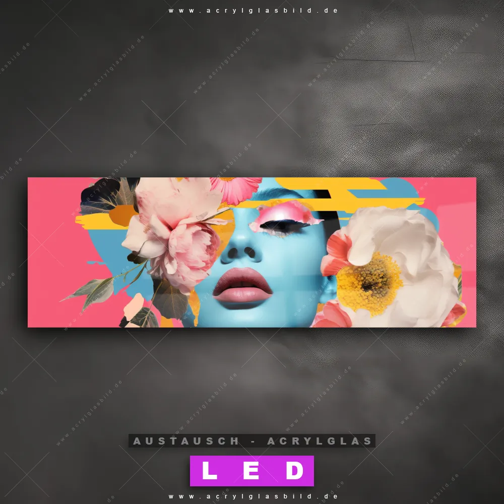 Begriffe wie Menschen & Blumen, Frau, Porträt, Gesicht, Blumen, Blüten, Frisur, Haare haben dich auf der Suche nach deinem neuen Austausch-Acrylglasbild inspiriert? Dann sollte das Wechsel-Acrylglasbild Pop Art Frau mit Blumen für dein bereits vorhandenes LED Acrylglasbild Canvalight® DIA den Weg zu dir finden.