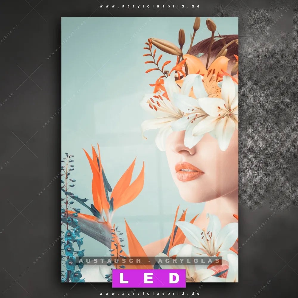 Begriffe wie Menschen & Blumen, Frau, Porträt, Gesicht, Blumen, Blüten, Frisur, Haare haben dich auf der Suche nach deinem neuen Austausch-Acrylglasbild inspiriert? Dann sollte das Wechsel-Acrylglasbild Schöne Frau umgeben von Blumen für dein bereits vorhandenes LED Acrylglasbild Canvalight® DIA den Weg zu dir finden.