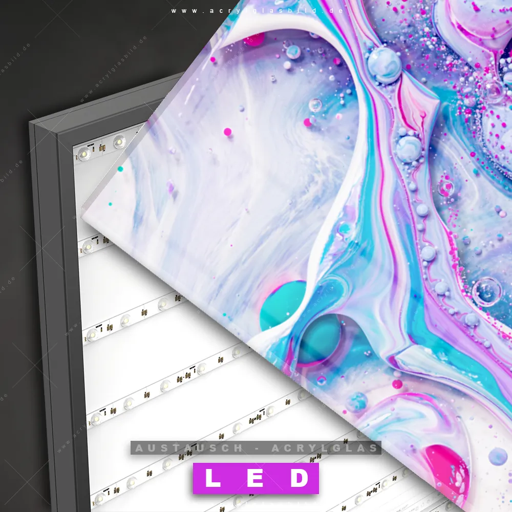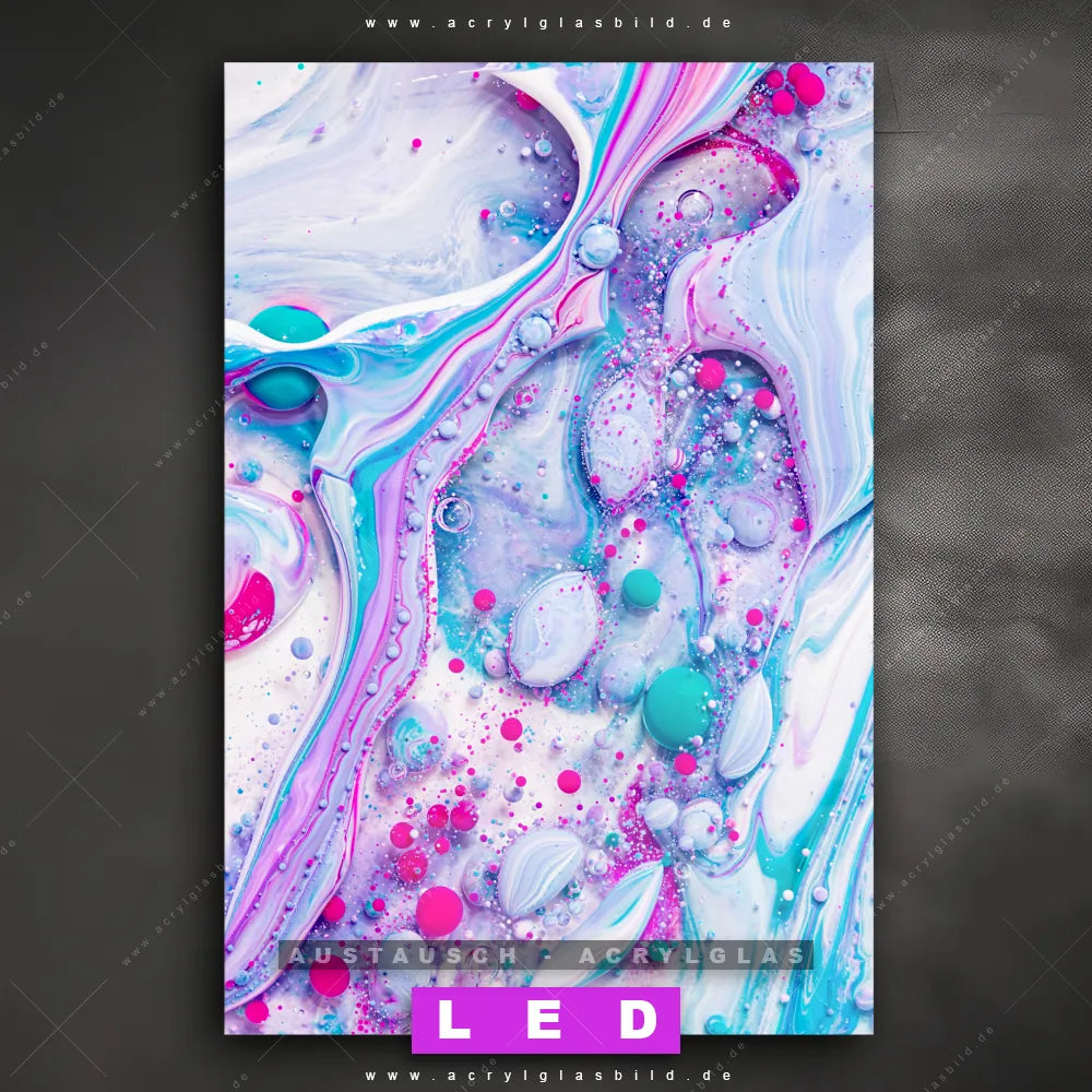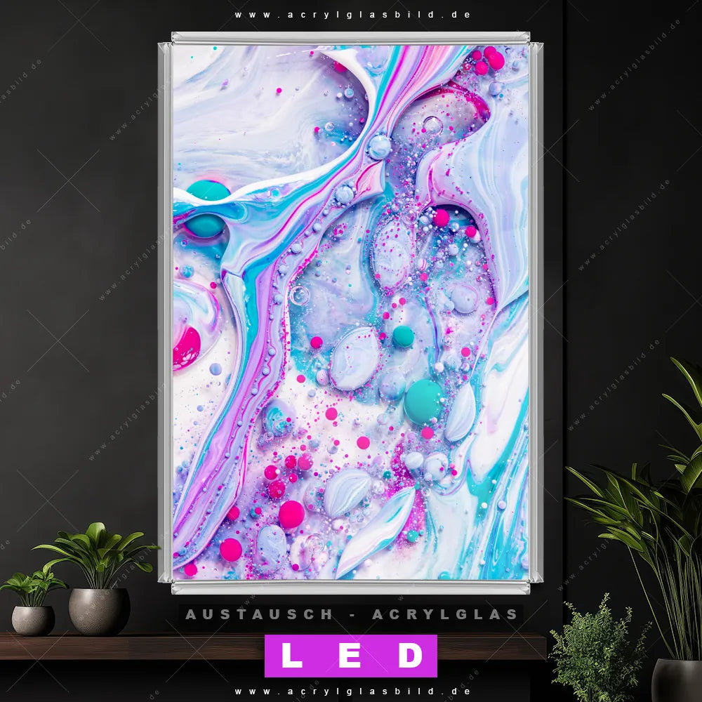 Begriffe wie Flüssigkeit, Acryl, flüssig, Farbe, Tropfen, Blasen, Kunst, Tinte, Fluid Art haben dich auf der Suche nach deinem neuen Austausch-Acrylglasbild inspiriert? Dann sollte das Wechsel-Acrylglasbild Farbzusammenspiel Rosa-Türkis für dein bereits vorhandenes LED Acrylglasbild Canvalight® DIA den Weg zu dir finden.