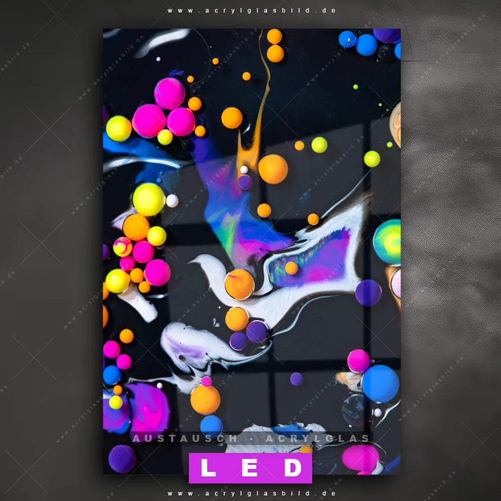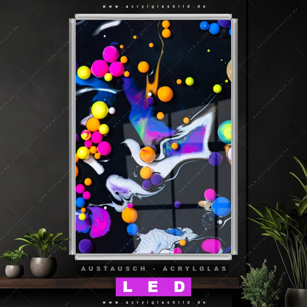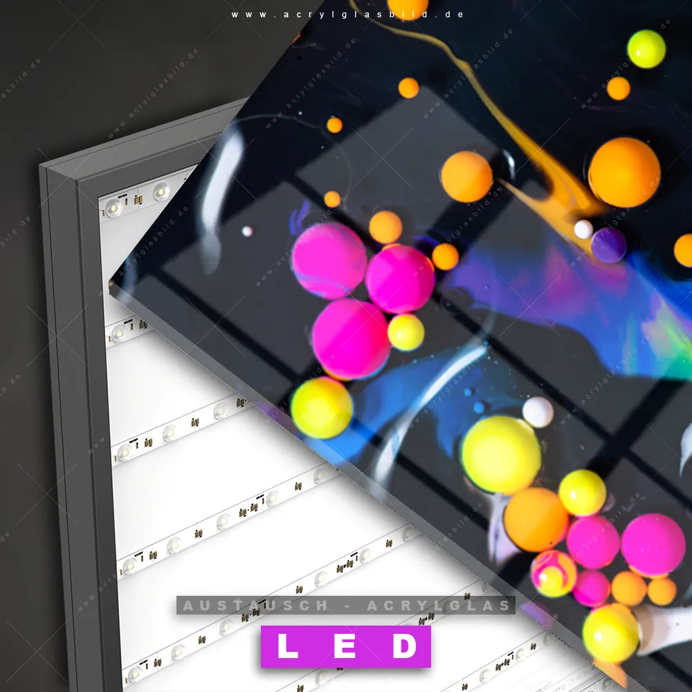 Begriffe wie Flüssigkeit, Acryl, flüssig, Farbe, Tropfen, Blasen, Kunst, Tinte, Fluid Art haben dich auf der Suche nach deinem neuen Austausch-Acrylglasbild inspiriert? Dann sollte das Wechsel-Acrylglasbild Farbkugeln für dein bereits vorhandenes LED Acrylglasbild Canvalight® DIA den Weg zu dir finden.