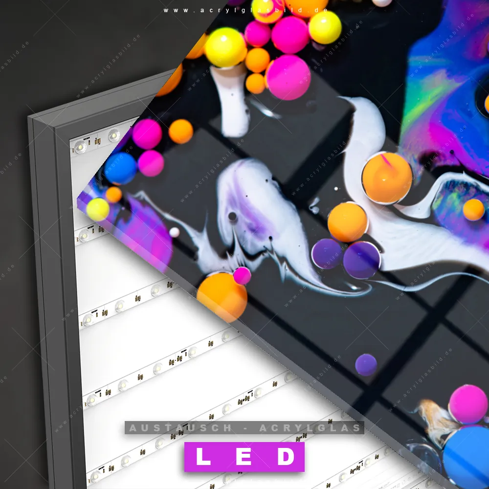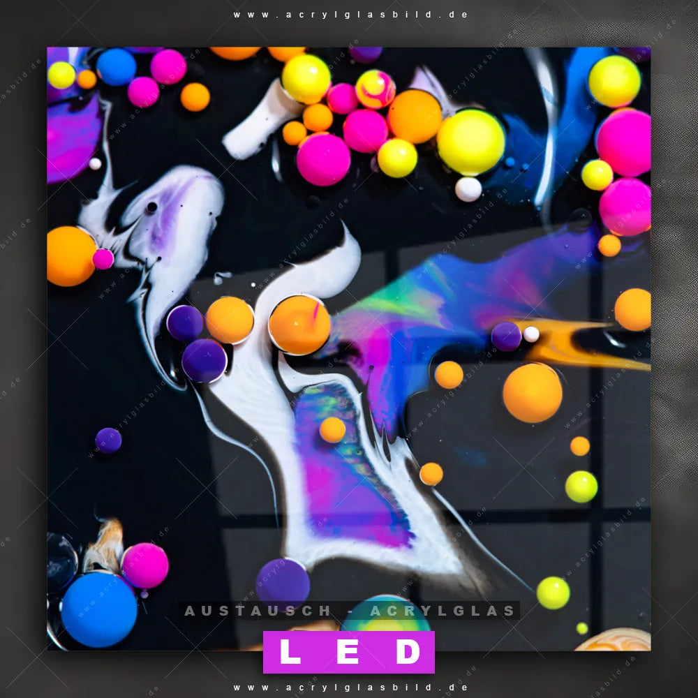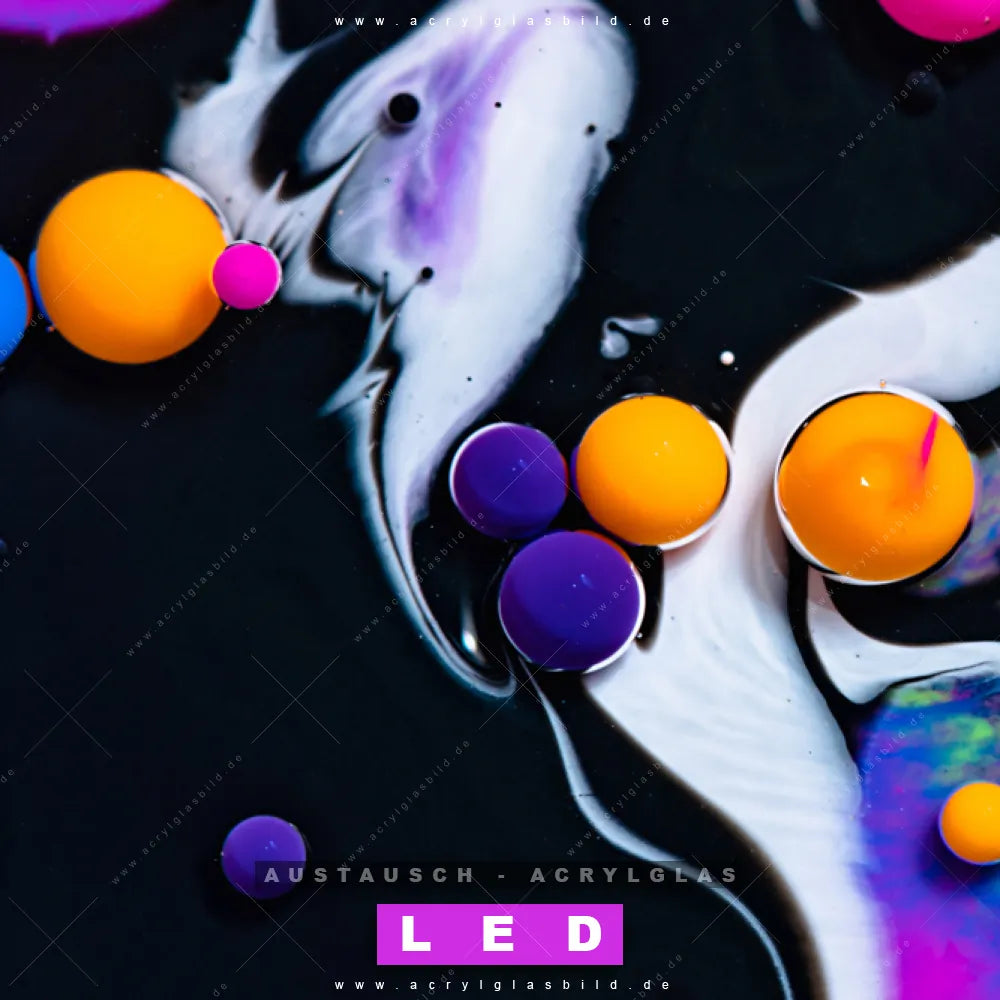 Begriffe wie Flüssigkeit, Acryl, flüssig, Farbe, Tropfen, Blasen, Kunst, Tinte, Fluid Art haben dich auf der Suche nach deinem neuen Austausch-Acrylglasbild inspiriert? Dann sollte das Wechsel-Acrylglasbild Farbkugeln für dein bereits vorhandenes LED Acrylglasbild Canvalight® DIA den Weg zu dir finden.