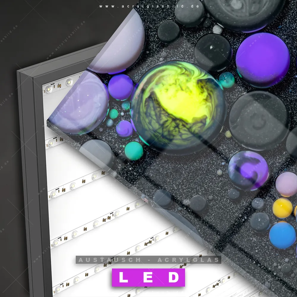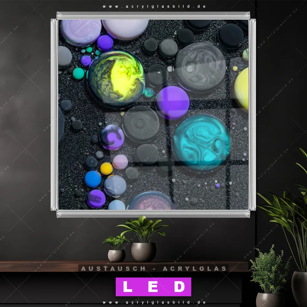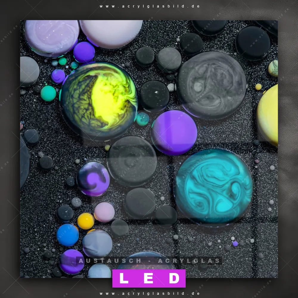 Begriffe wie Flüssigkeit, Acryl, flüssig, Farbe, Marmorierung, Tropfen, Blasen, Fluid Art haben dich auf der Suche nach deinem neuen Austausch-Acrylglasbild inspiriert? Dann sollte das Wechsel-Acrylglasbild abstrakte Kugeln im Sand für dein bereits vorhandenes LED Acrylglasbild Canvalight® DIA den Weg zu dir finden.