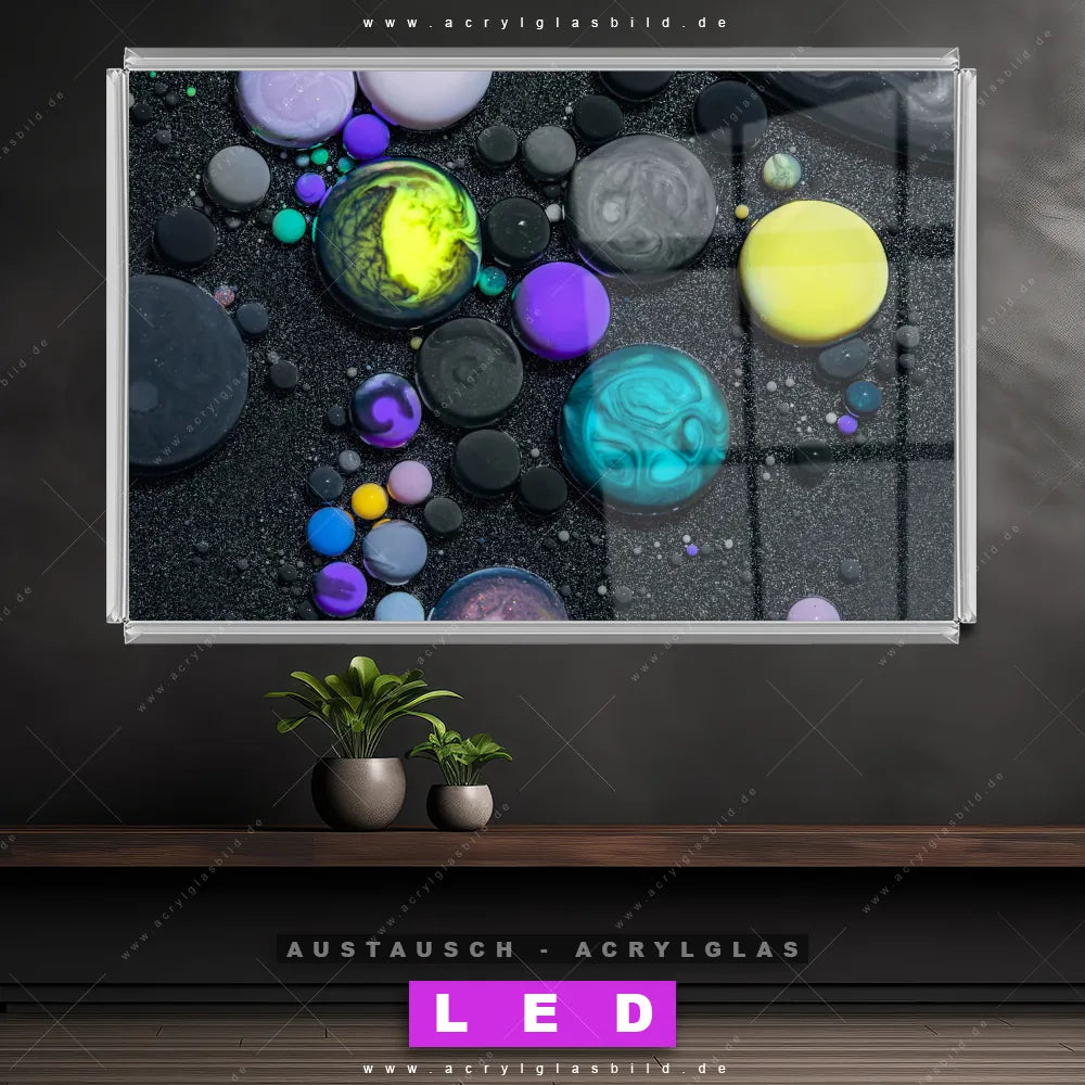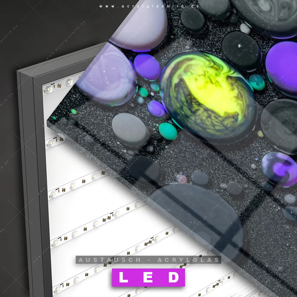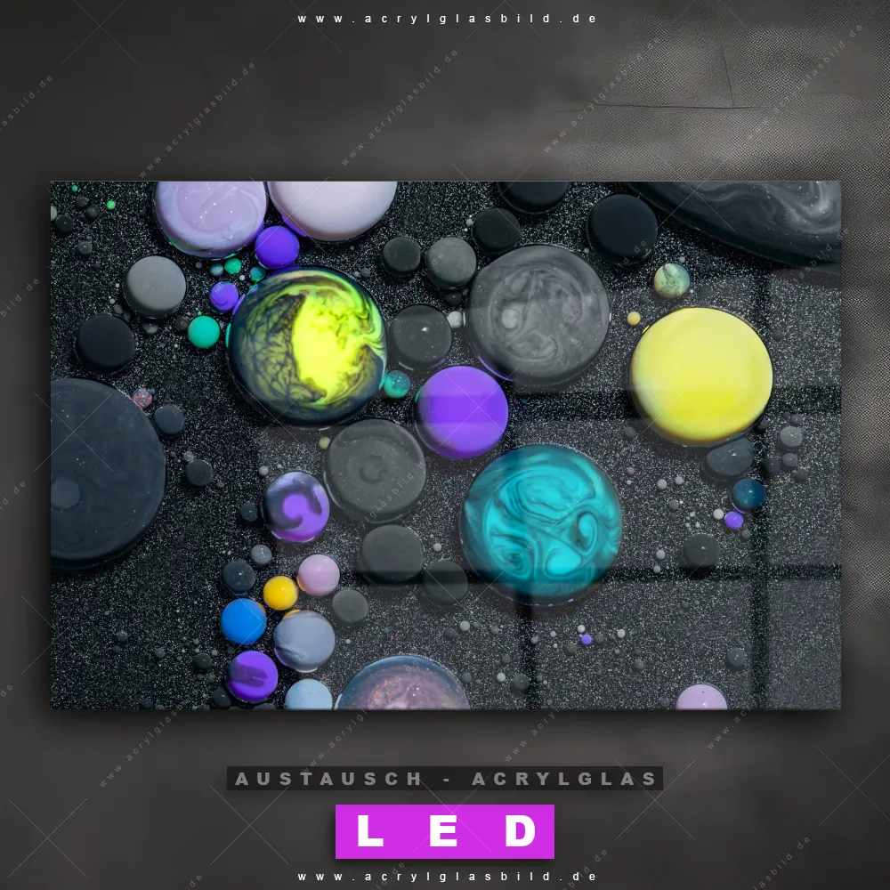 Begriffe wie Flüssigkeit, Acryl, flüssig, Farbe, Marmorierung, Tropfen, Blasen, Fluid Art haben dich auf der Suche nach deinem neuen Austausch-Acrylglasbild inspiriert? Dann sollte das Wechsel-Acrylglasbild abstrakte Kugeln im Sand für dein bereits vorhandenes LED Acrylglasbild Canvalight® DIA den Weg zu dir finden.