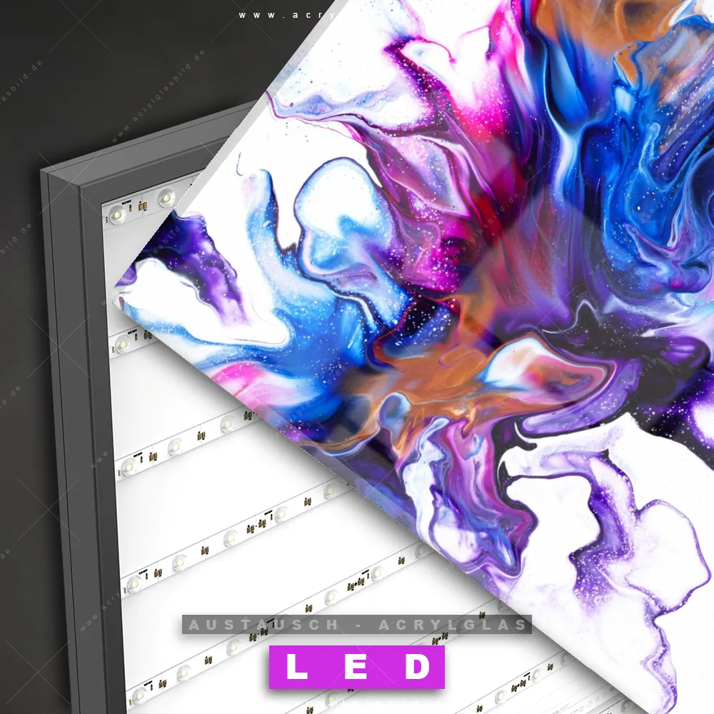 Begriffe wie Flüssigkeit, Acryl, flüssig, Farbe, Marmorierung, Tinte, Alkohol, Fluid Art haben dich auf der Suche nach deinem neuen Austausch-Acrylglasbild inspiriert? Dann sollte das Wechsel-Acrylglasbild Farblauf für dein bereits vorhandenes LED Acrylglasbild Canvalight® DIA den Weg zu dir finden.