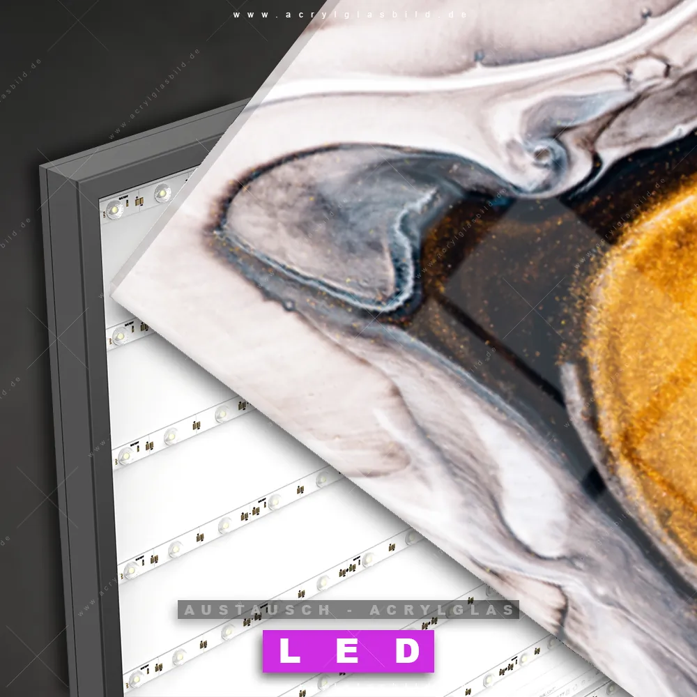 Begriffe wie Flüssigkeit, Acryl, flüssig, Farbe, Marmorierung, Tinte, Alkohol, Goldader, Fluid Art haben dich auf der Suche nach deinem neuen Austausch-Acrylglasbild inspiriert? Dann sollte das Wechsel-Acrylglasbild Fluid Painting - Goldakzente für dein bereits vorhandenes LED Acrylglasbild Canvalight® DIA den Weg zu dir finden.