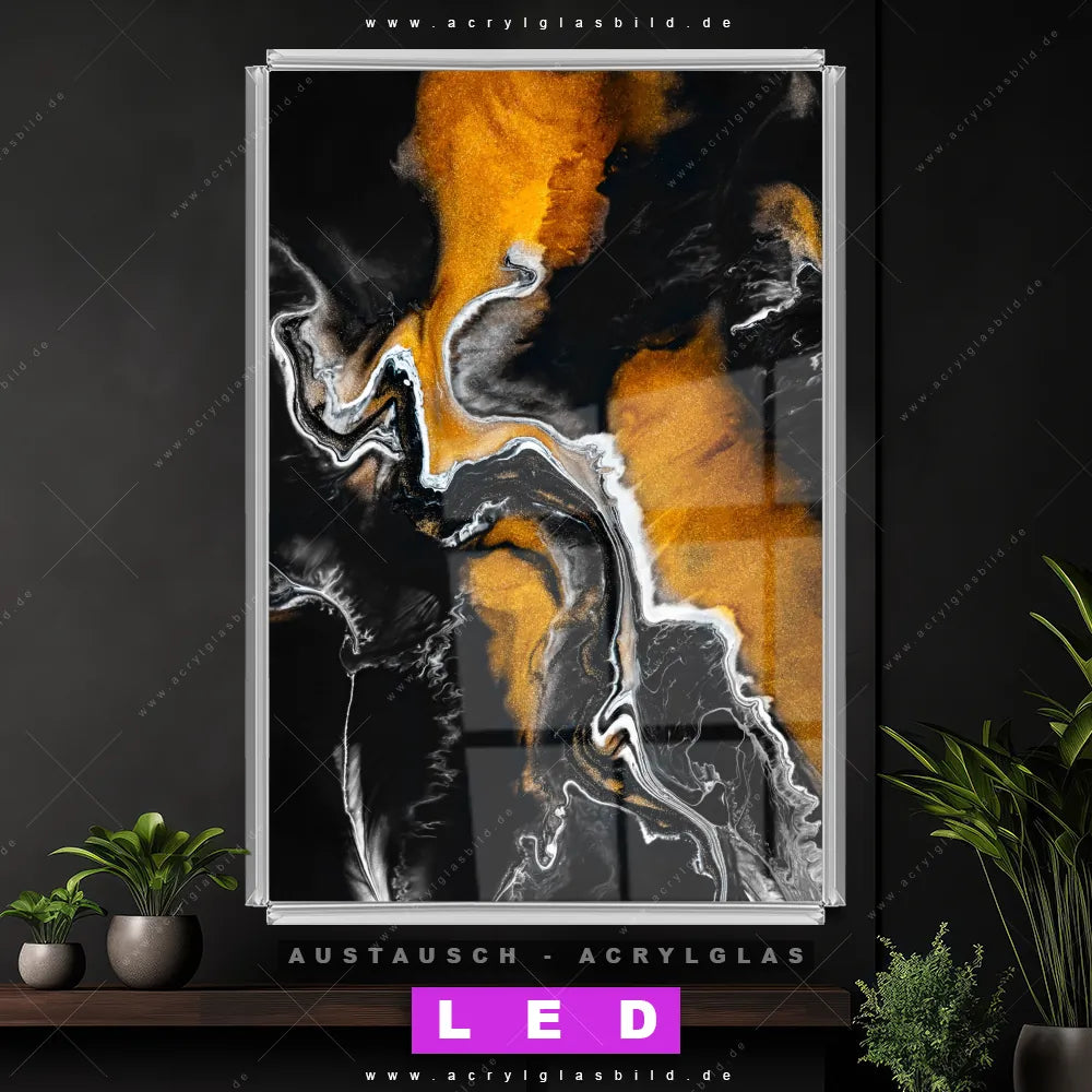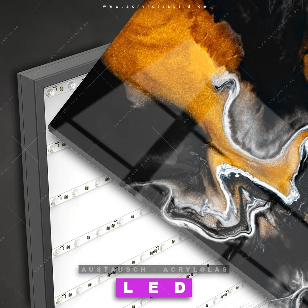 Begriffe wie Flüssigkeit, Acryl, flüssig, Farbe, Marmorierung, Tinte, Alkohol, Fluid Art haben dich auf der Suche nach deinem neuen Austausch-Acrylglasbild inspiriert? Dann sollte das Wechsel-Acrylglasbild Farbfluss gold-schwarz für dein bereits vorhandenes LED Acrylglasbild Canvalight® DIA den Weg zu dir finden.
