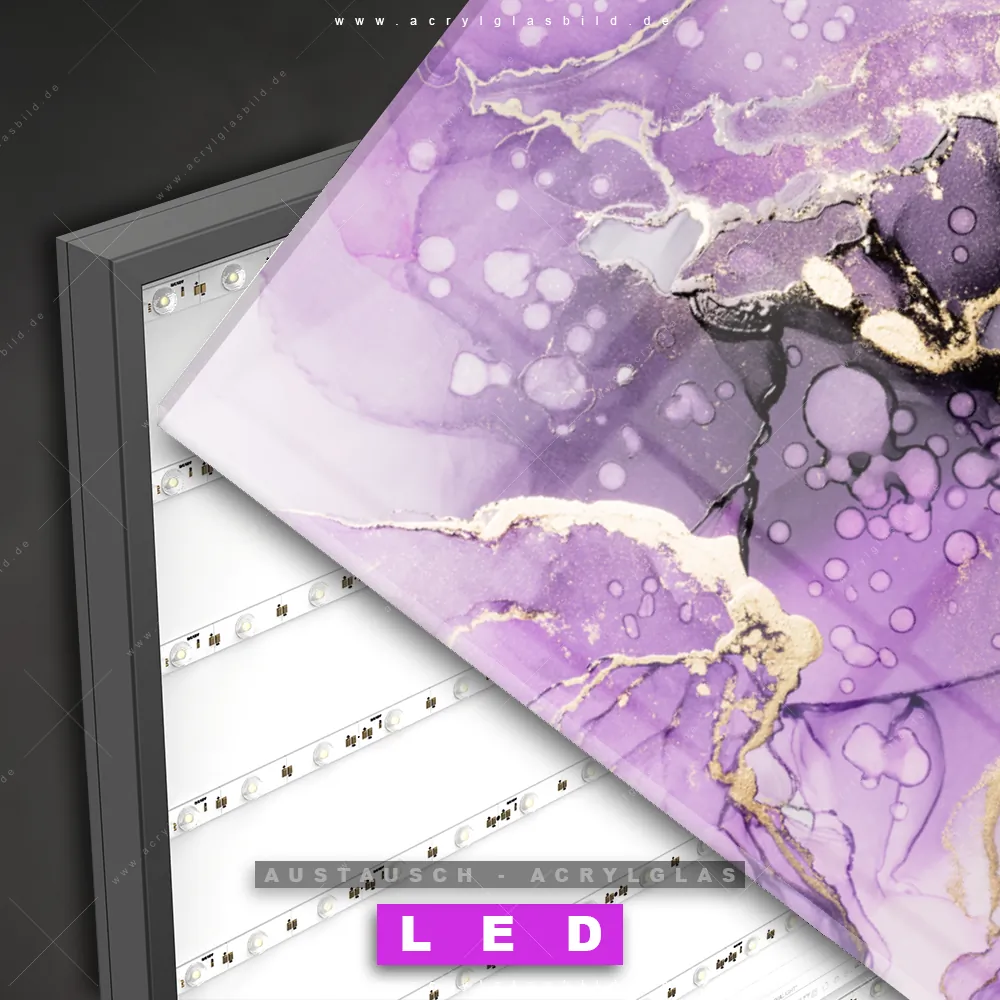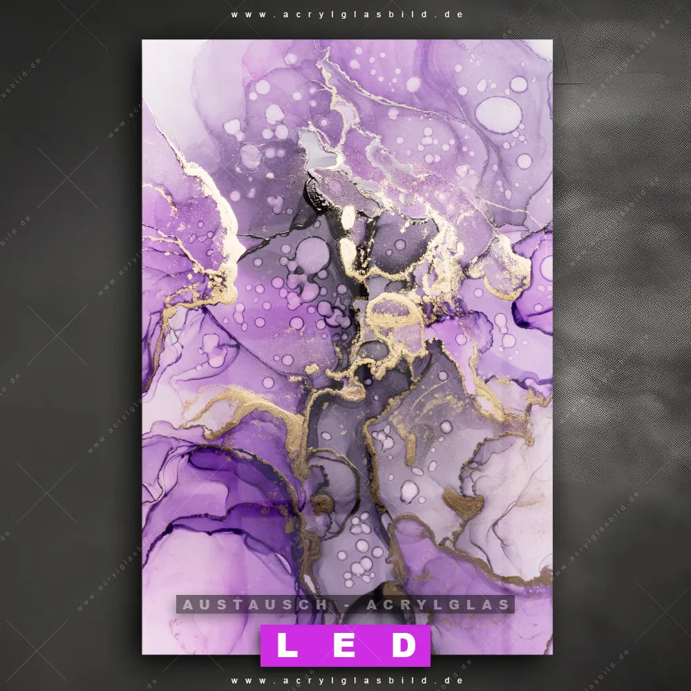 Begriffe wie Flüssigkeit, Acryl, flüssig, Farbe, Marmorierung, Tinte, Alkohol, Fluid Art haben dich auf der Suche nach deinem neuen Austausch-Acrylglasbild inspiriert? Dann sollte das Wechsel-Acrylglasbild Fluid Painting lila-gold für dein bereits vorhandenes LED Acrylglasbild Canvalight® DIA den Weg zu dir finden.