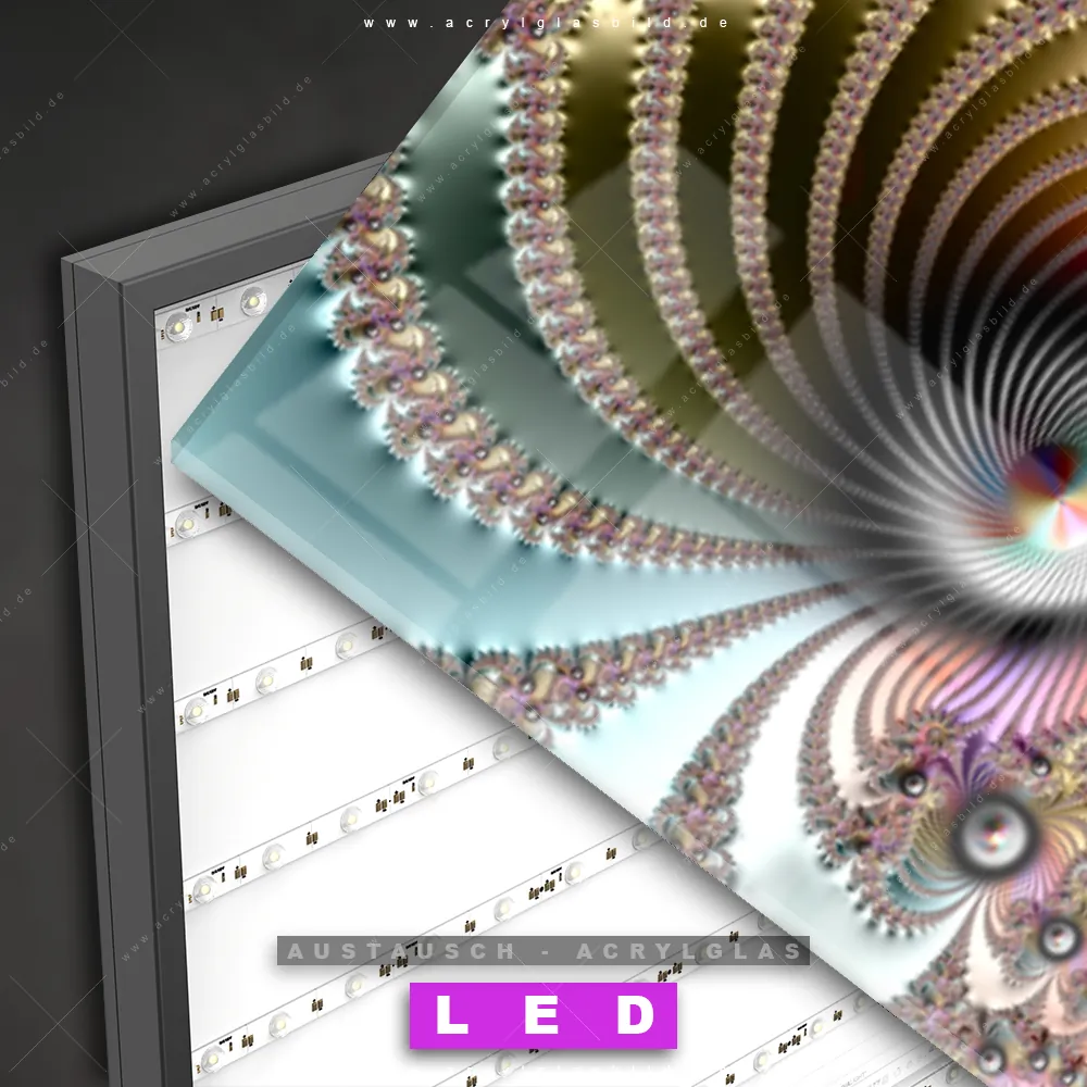 Begriffe wie Spirale, Muster, Abstrakt, Digital, Blumen haben dich auf der Suche nach deinem neuen Austausch-Acrylglasbild inspiriert? Dann sollte das Wechsel-Acrylglasbild Kunst mit geometrischen Formen für dein bereits vorhandenes LED Acrylglasbild Canvalight® DIA den Weg zu dir finden.
