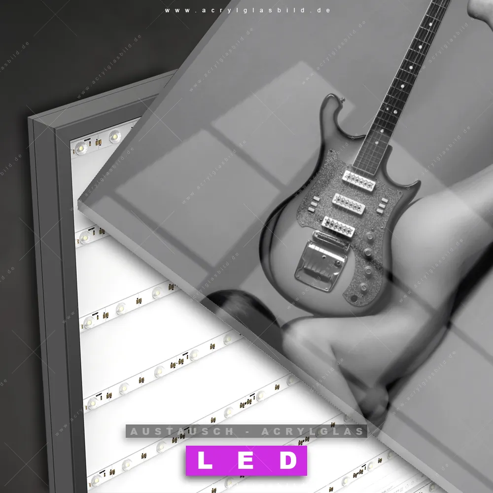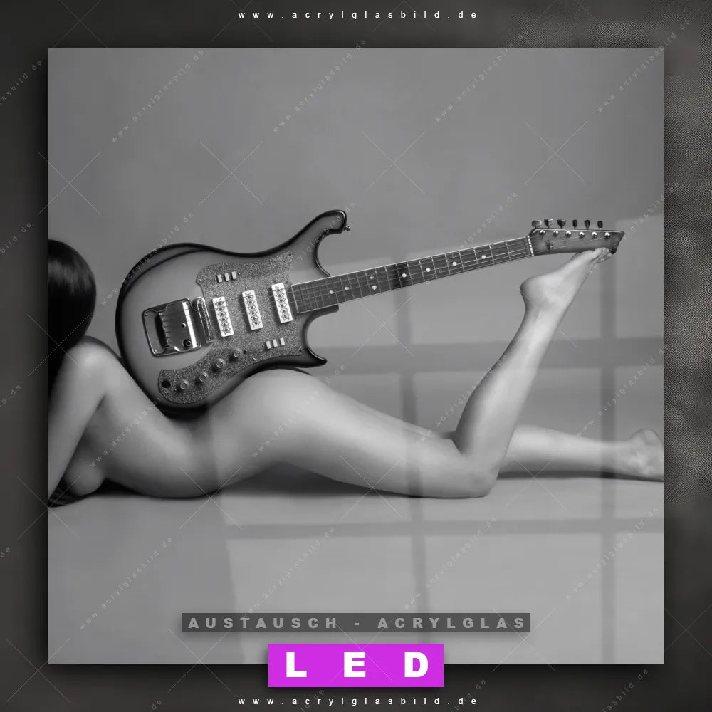 Begriffe wie Frau, Erotik, modern, Beauty, Körper, Body, Akt, Musik, Gitarre, Instrument haben dich auf der Suche nach deinem neuen Austausch-Acrylglasbild inspiriert? Dann sollte das Wechsel-Acrylglasbild erotische Pose einer Frau mit Gitarre für dein bereits vorhandenes LED Acrylglasbild Canvalight® DIA den Weg zu dir finden.