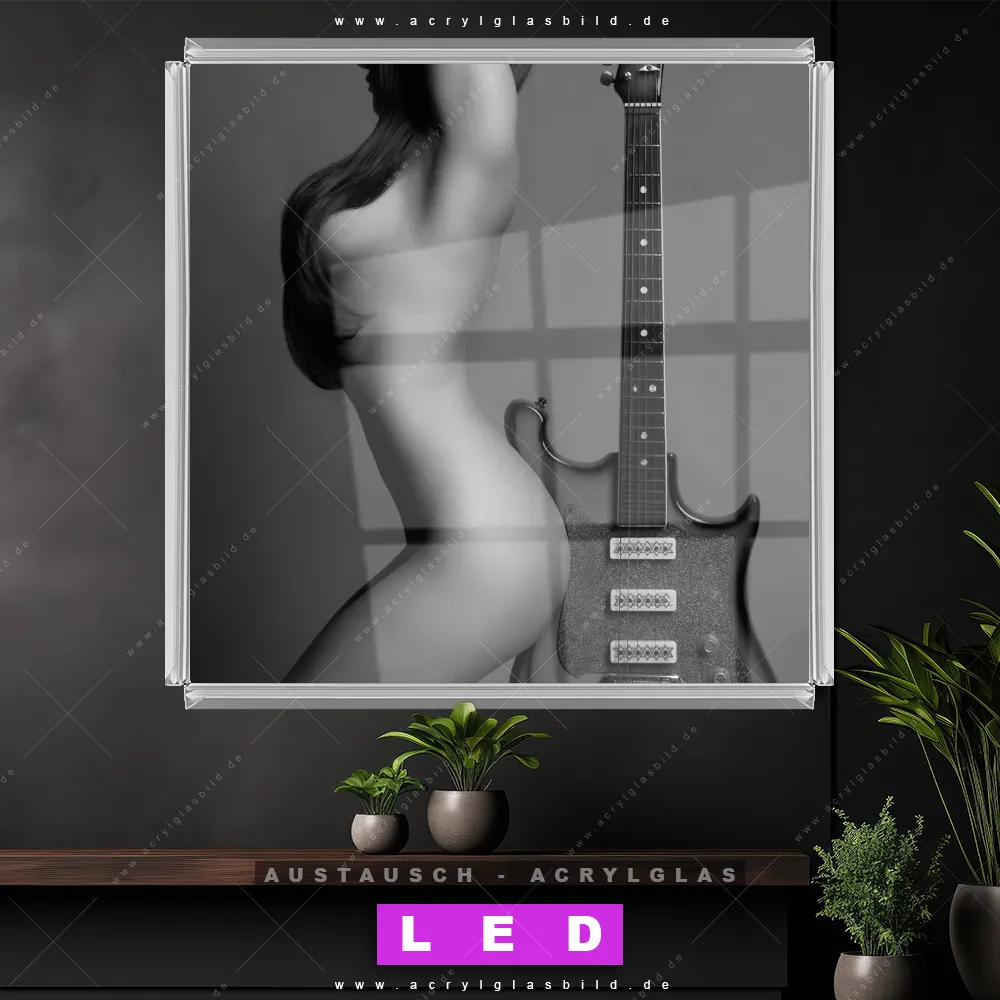 Begriffe wie Frau, Erotik, modern, Beauty, Körper, Body, Akt, Musik, Gitarre, Instrument haben dich auf der Suche nach deinem neuen Austausch-Acrylglasbild inspiriert? Dann sollte das Wechsel-Acrylglasbild Frau hält Gitarre hinter sich für dein bereits vorhandenes LED Acrylglasbild Canvalight® DIA den Weg zu dir finden.