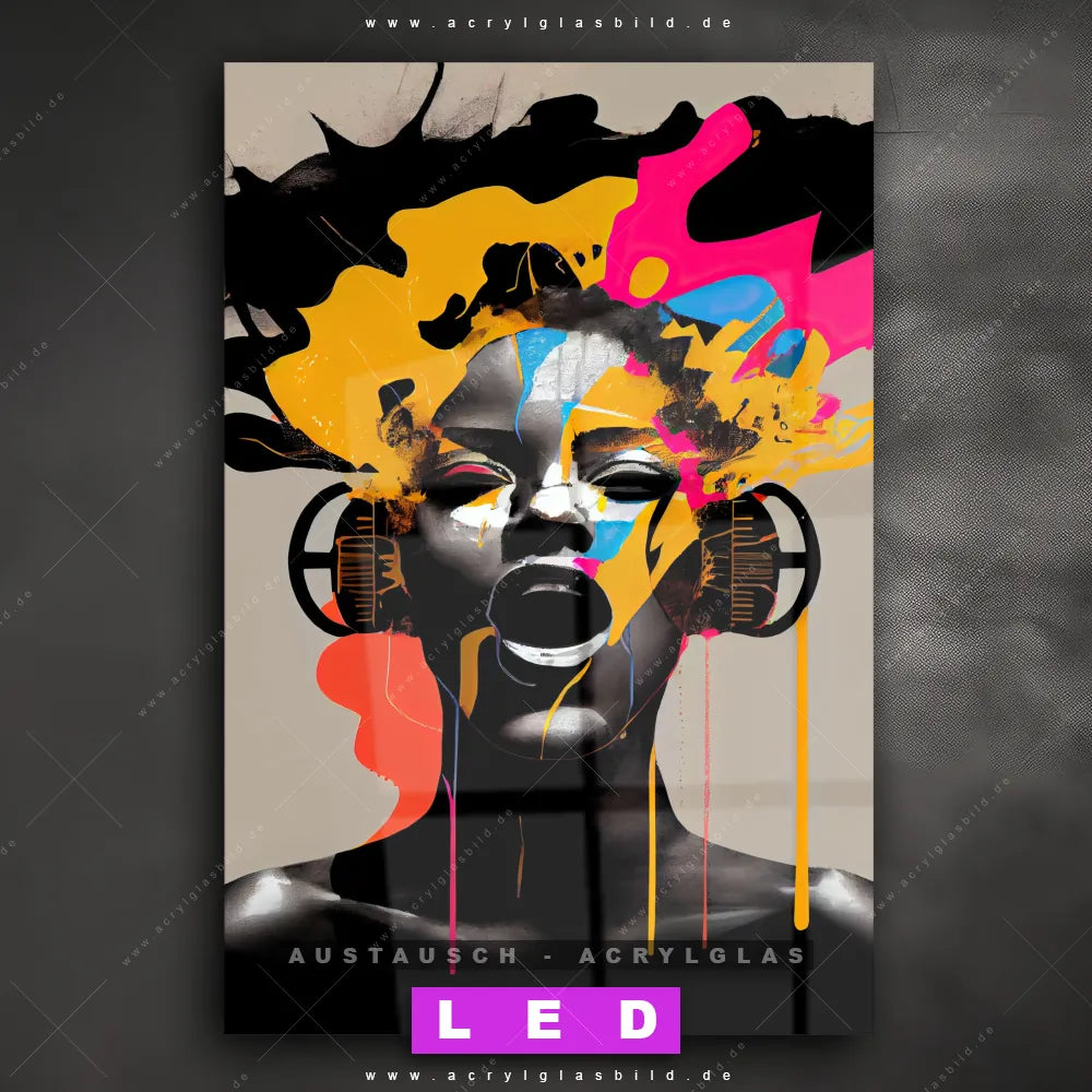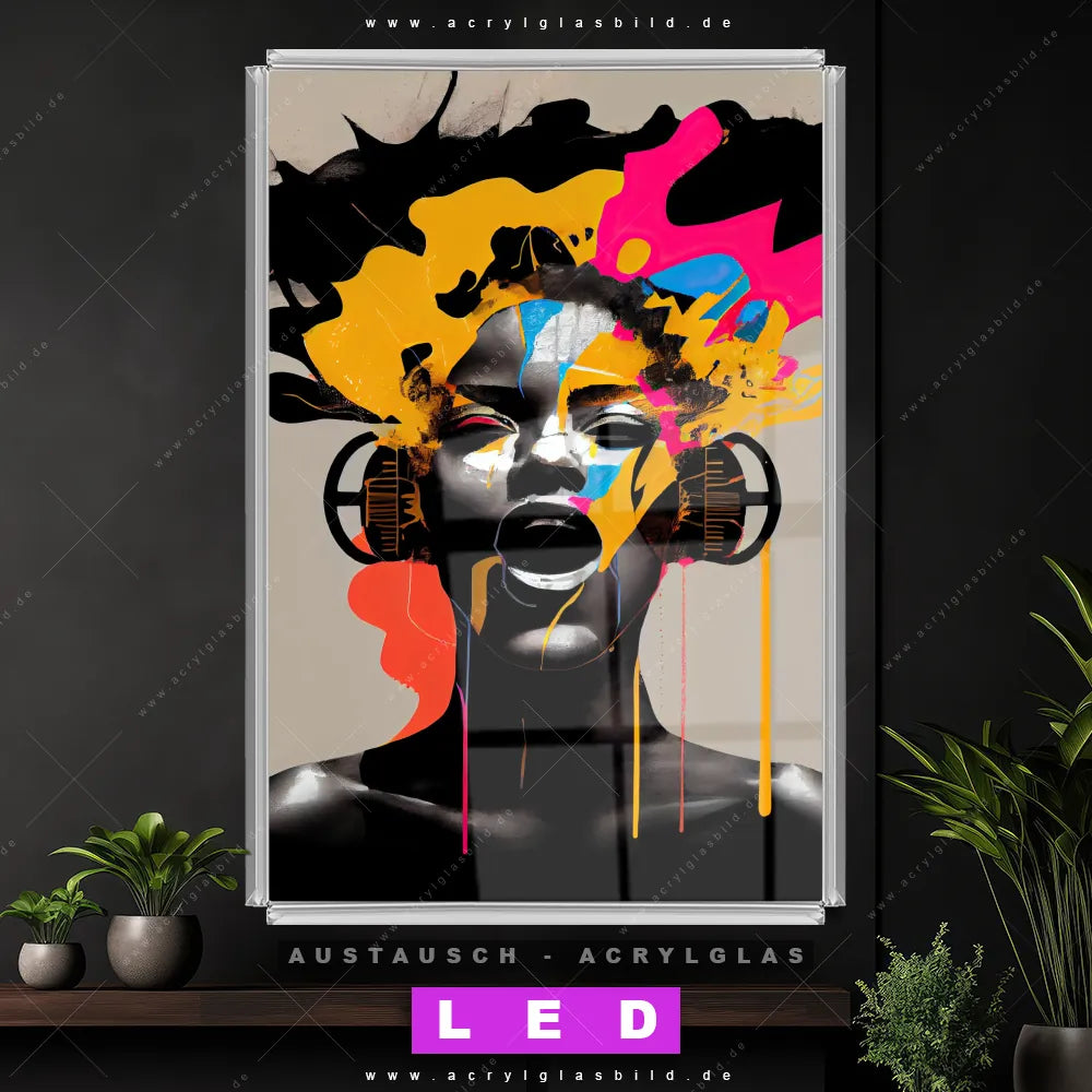 Begriffe wie Frau, Portrait, Gesicht, Mädchen, Dame, Farbe, Musik, Kopfhörer haben dich auf der Suche nach deinem neuen Austausch-Acrylglasbild inspiriert? Dann sollte das Wechsel-Acrylglasbild Musik in bunten Farben für dein bereits vorhandenes LED Acrylglasbild Canvalight® DIA den Weg zu dir finden.