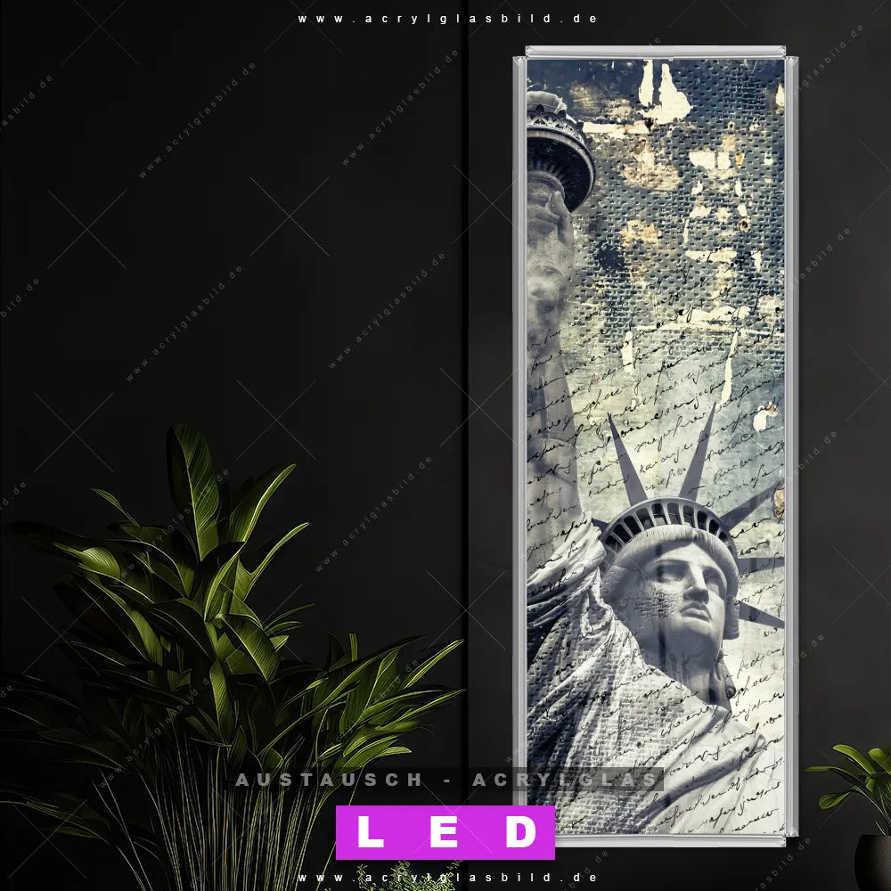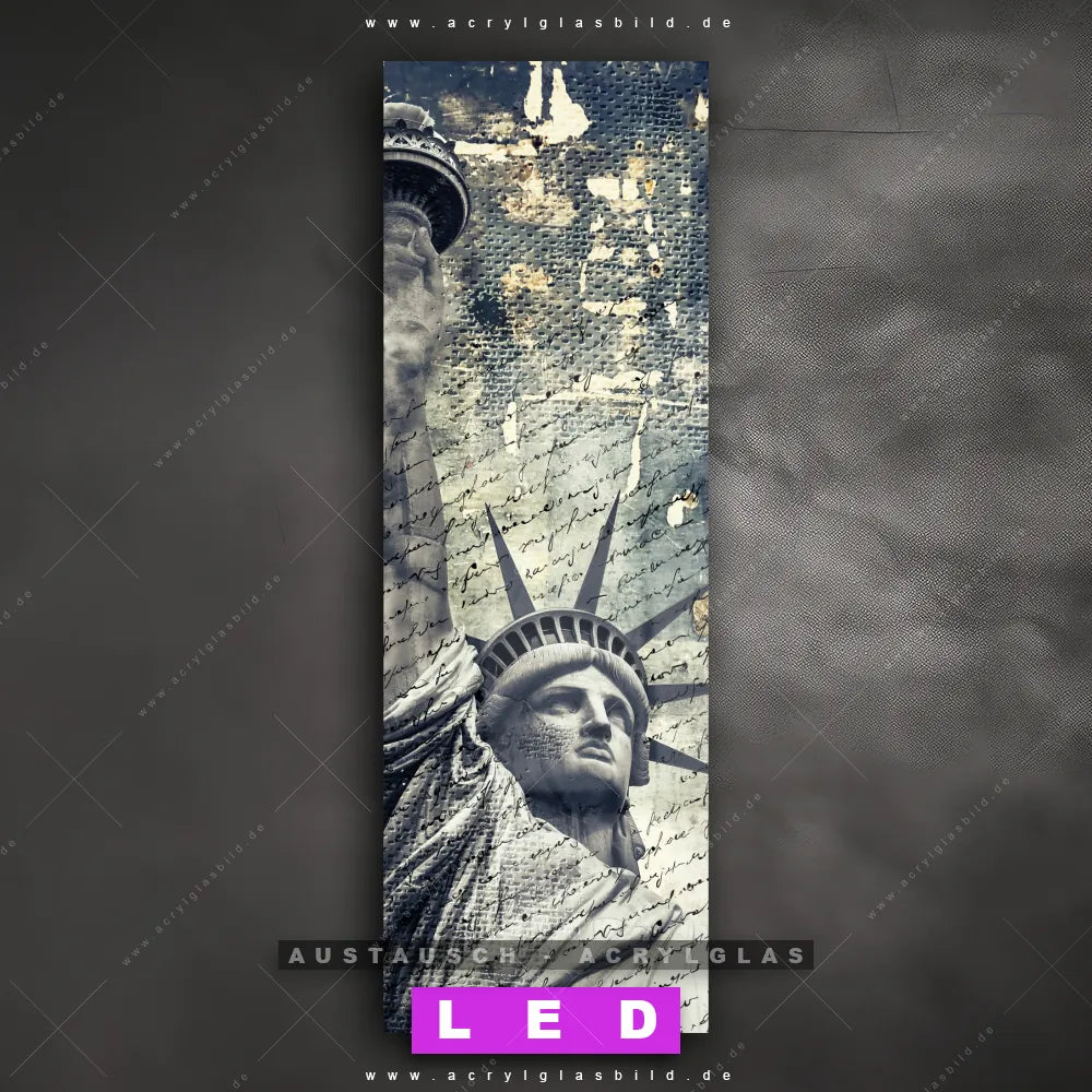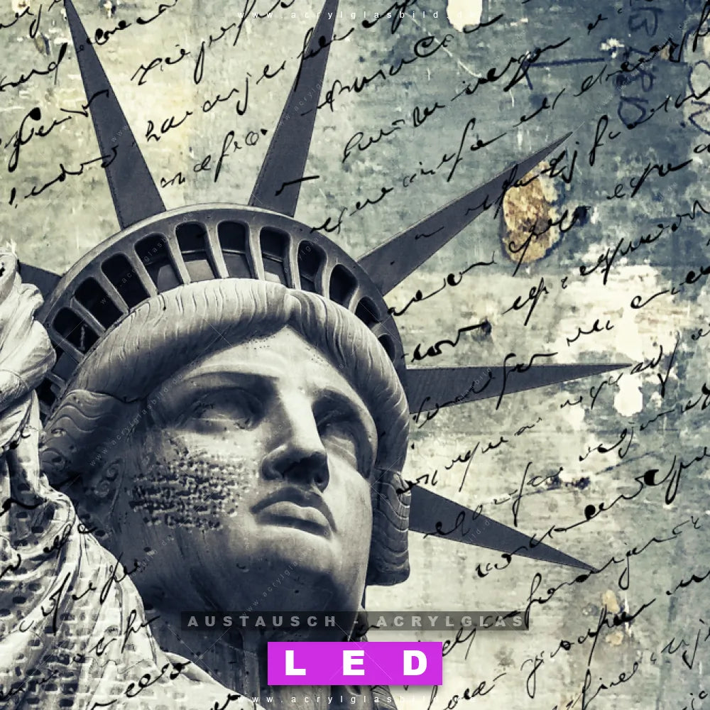 Begriffe wie Porträt, Grunge, Streetart, modern, Freiheitsstatue, Statue of Liberty, Amerika, USA haben dich auf der Suche nach deinem neuen Austausch-Acrylglasbild inspiriert? Dann sollte das Wechsel-Acrylglasbild Künstlerische Freiheitsstatue mit Schriftzug für dein bereits vorhandenes LED Acrylglasbild Canvalight® DIA den Weg zu dir finden.