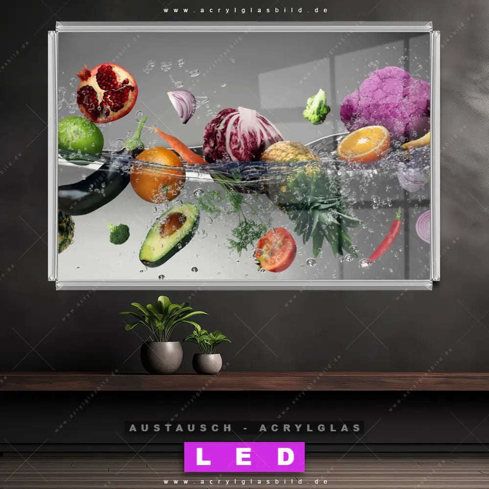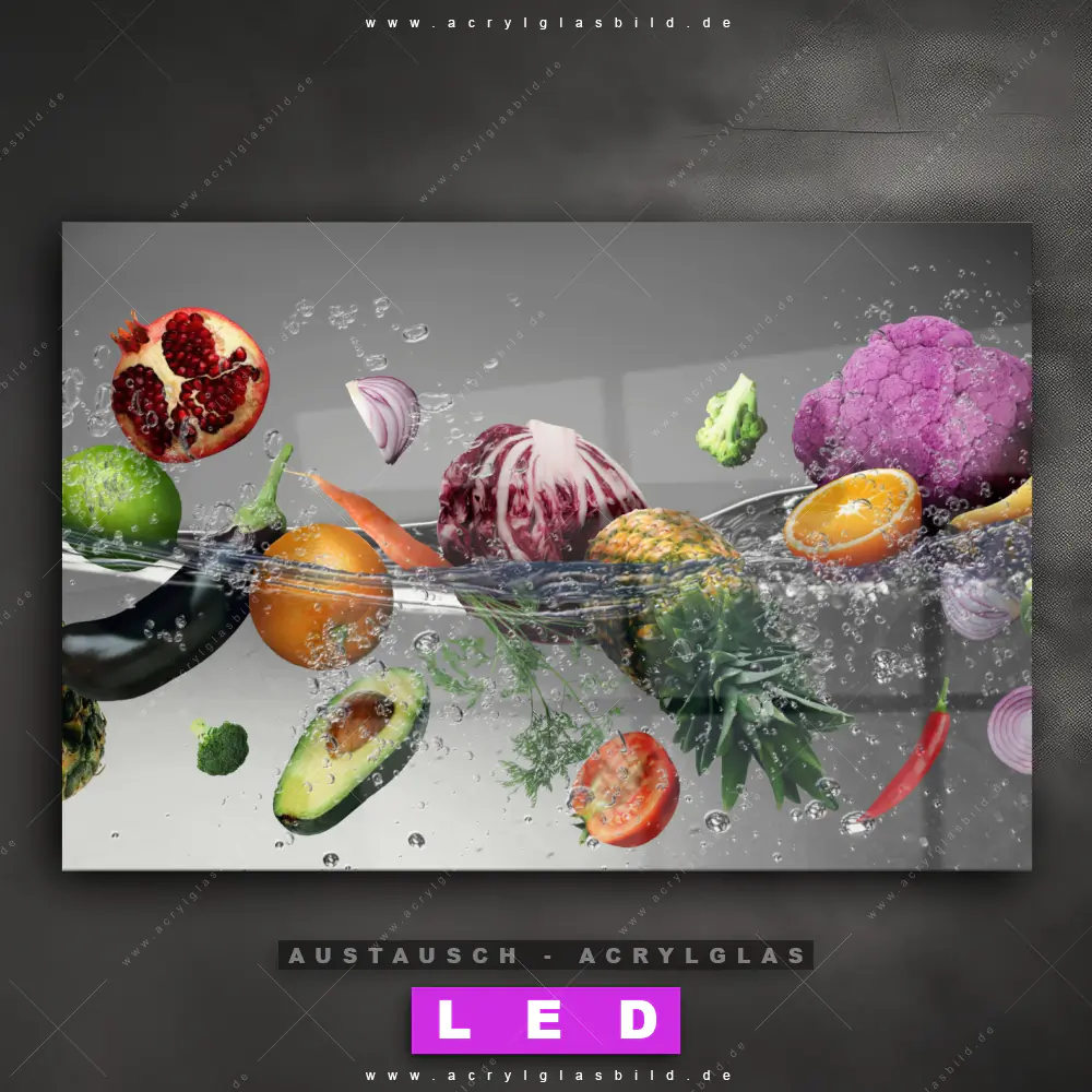 Begriffe wie Obst, Zitrusfrüchte, Früchte, Banane, Ananas, Spritzwasser, Wasser, Spritzer, Tropfen, Wassertropfen, Ernährung, Gesundheit, Lebensmittel haben dich auf der Suche nach deinem neuen Austausch-Acrylglasbild inspiriert? Dann sollte das Wechsel-Acrylglasbild Gemüse im Wasserstrahl für dein bereits vorhandenes LED Acrylglasbild Canvalight® DIA den Weg zu dir finden.