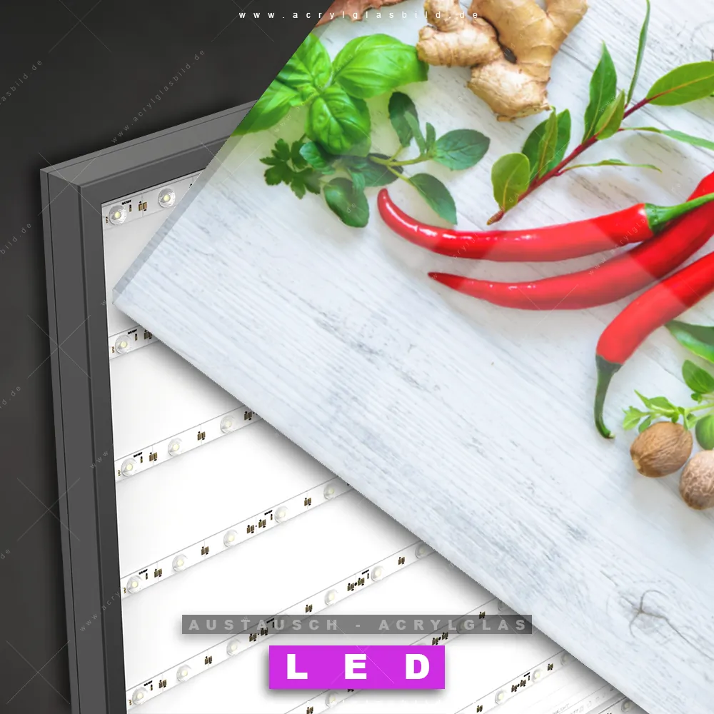 Begriffe wie Gewürze, Kräuter, kochen, Pfeffer, Curry, Küche, Lebensmittel, gesund, Holz, Brett, Essen haben dich auf der Suche nach deinem neuen Austausch-Acrylglasbild inspiriert? Dann sollte das Wechsel-Acrylglasbild Gartenkräuter mit bunten Gewürzen für dein bereits vorhandenes LED Acrylglasbild Canvalight® DIA den Weg zu dir finden.