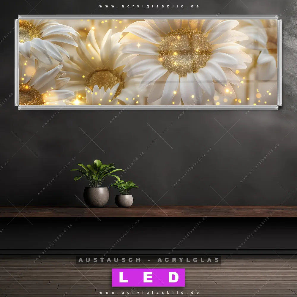 Begriffe wie Gänseblümchen, Blüten, Natur, Pflanze, Glitzer, Blütenmeer haben dich auf der Suche nach deinem neuen Austausch-Acrylglasbild inspiriert? Dann sollte das Wechsel-Acrylglasbild Glitzernde Gänseblümchen Kunst für dein bereits vorhandenes LED Acrylglasbild Canvalight® DIA den Weg zu dir finden.