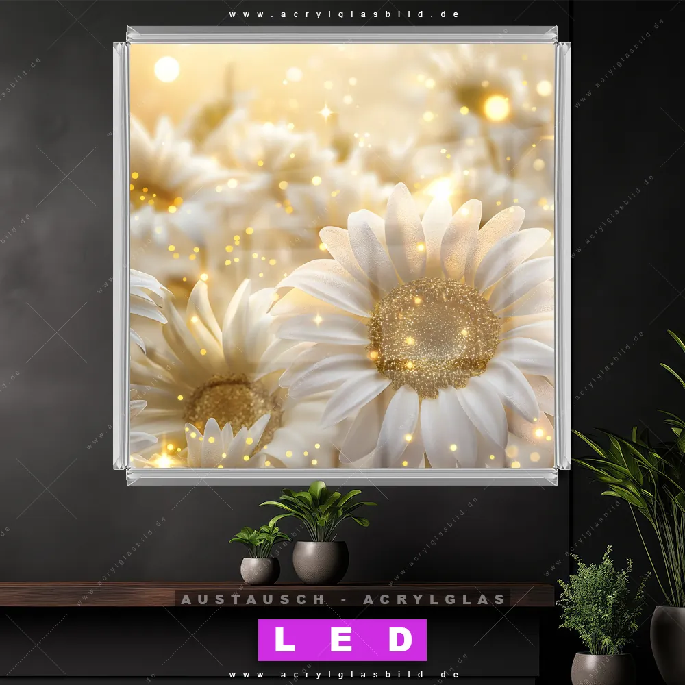 Begriffe wie Gänseblümchen, Blüten, Natur, Pflanze, Glitzer, Blütenmeer haben dich auf der Suche nach deinem neuen Austausch-Acrylglasbild inspiriert? Dann sollte das Wechsel-Acrylglasbild Glitzernde Gänseblümchen Kunst für dein bereits vorhandenes LED Acrylglasbild Canvalight® DIA den Weg zu dir finden.