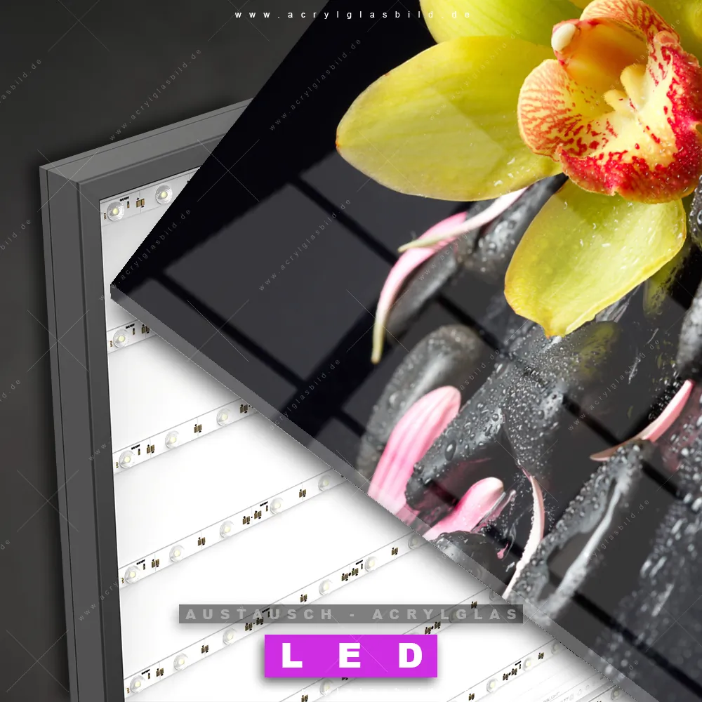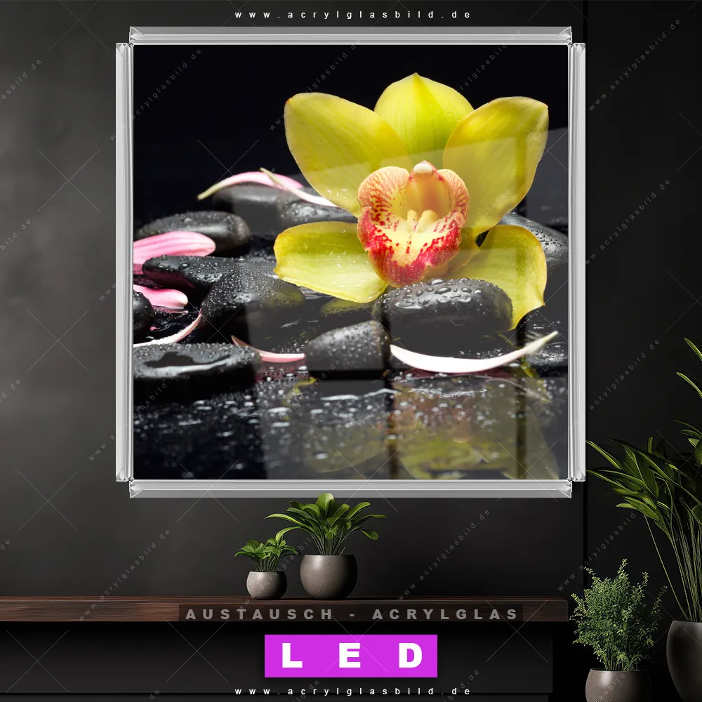 Begriffe wie Zen, Steine, Blume, Blüte, Pflanze, Tropfen, Orchidee haben dich auf der Suche nach deinem neuen Austausch-Acrylglasbild inspiriert? Dann sollte das Wechsel-Acrylglasbild Orchideenblüte auf schwarzen Steinen für dein bereits vorhandenes LED Acrylglasbild Canvalight® DIA den Weg zu dir finden.