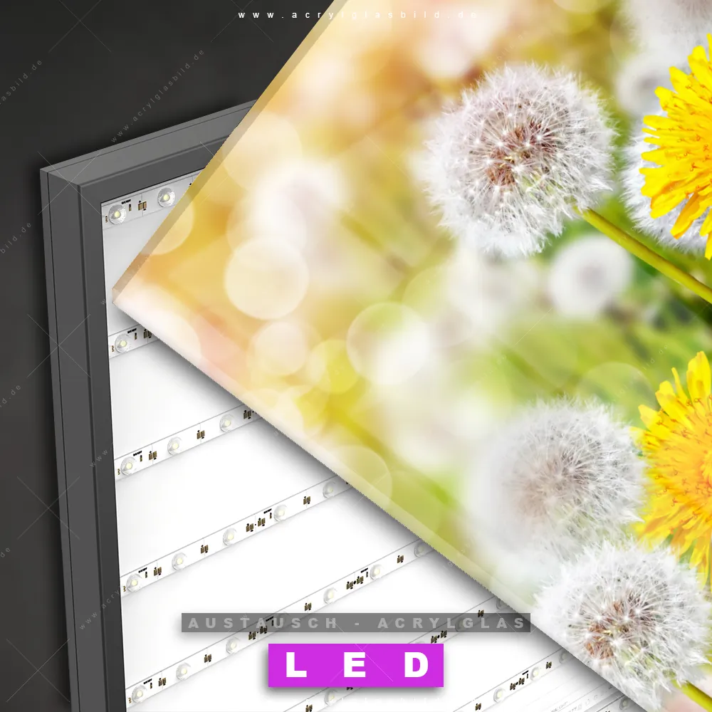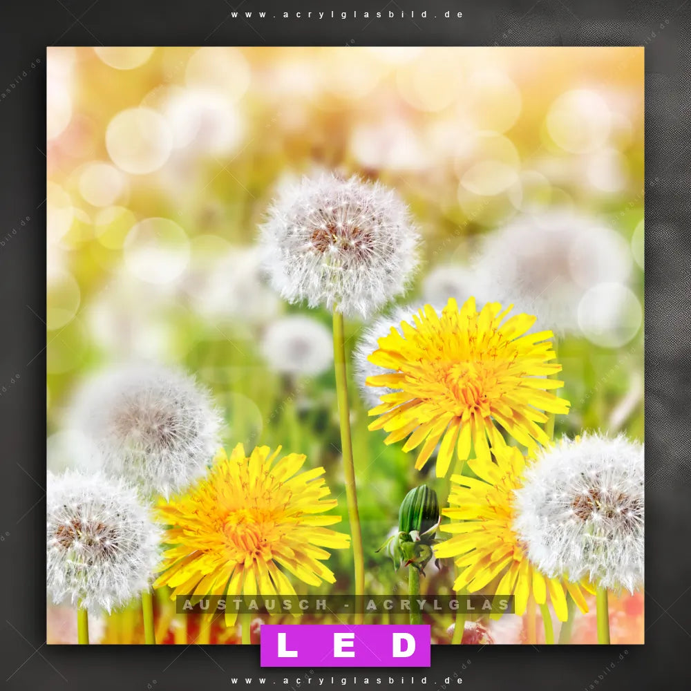 Begriffe wie Blume, Pflanze, Natur, Nahaufnahme, Pusteblume, Dandelion, Löwenzahn, Wiese haben dich auf der Suche nach deinem neuen Austausch-Acrylglasbild inspiriert? Dann sollte das Wechsel-Acrylglasbild Pusteblumen in sonnigem Gelb für dein bereits vorhandenes LED Acrylglasbild Canvalight® DIA den Weg zu dir finden.