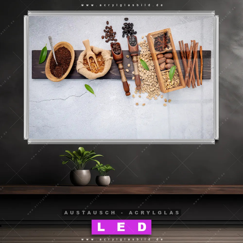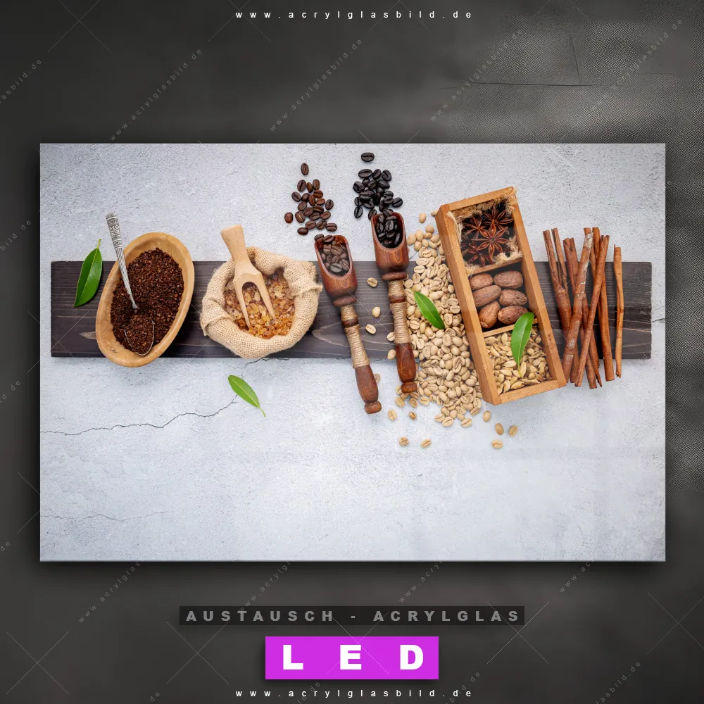 Begriffe wie Kaffee, Coffee, Küche, Kaffebohnen, Bohne, Genuss, Aroma, Brauner Zucker, Zimtstangen, Sternanis, Holzbrett haben dich auf der Suche nach deinem neuen Austausch-Acrylglasbild inspiriert? Dann sollte das Wechsel-Acrylglasbild Leckeres Kaffee-Arrangement für dein bereits vorhandenes LED Acrylglasbild Canvalight® DIA den Weg zu dir finden.