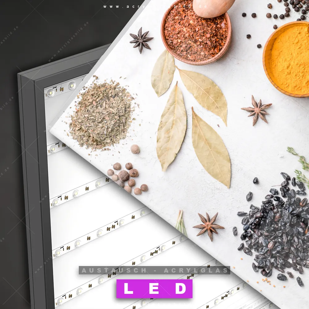 Begriffe wie Gewürze, Kräuter, kochen, Pfeffer, Paprika, Lebensmittel, Ernährung, Essen, Curry, Löffel, Holzlöffel haben dich auf der Suche nach deinem neuen Austausch-Acrylglasbild inspiriert? Dann sollte das Wechsel-Acrylglasbild Viele aromatische Gewürze für dein bereits vorhandenes LED Acrylglasbild Canvalight® DIA den Weg zu dir finden.