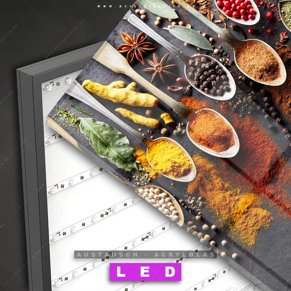 Begriffe wie Gewürze, Kräuter, Löffel, kochen, Pfeffer, Curry haben dich auf der Suche nach deinem neuen Austausch-Acrylglasbild inspiriert? Dann sollte das Wechsel-Acrylglasbild alte Löffel mit vielen Gewürzen für dein bereits vorhandenes LED Acrylglasbild Canvalight® DIA den Weg zu dir finden.