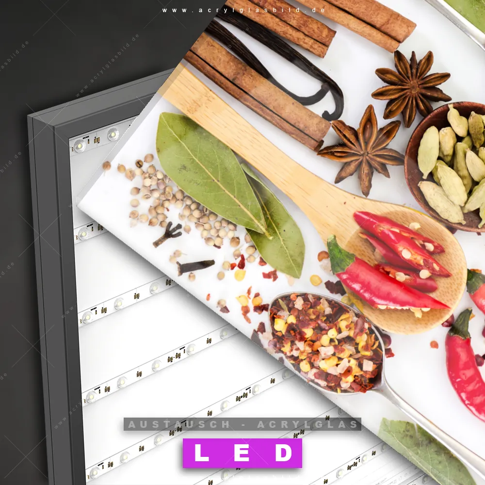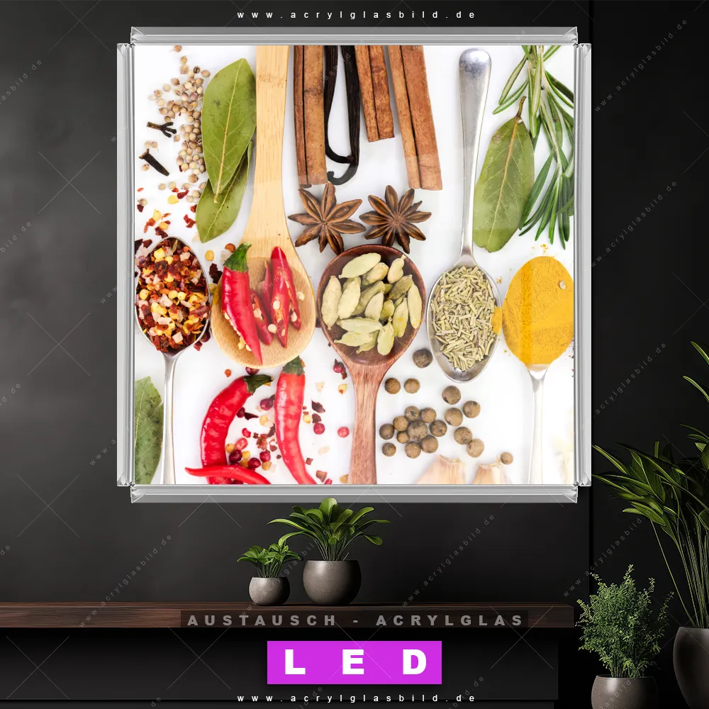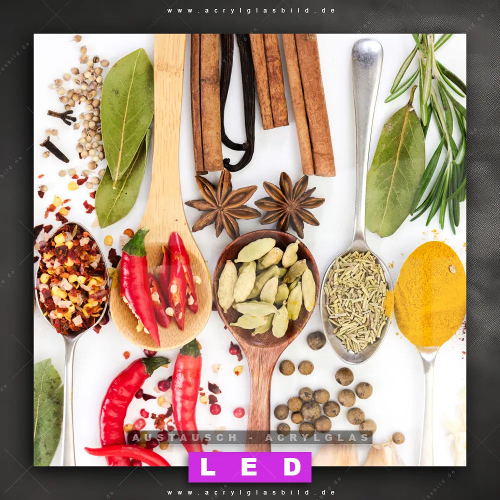 Begriffe wie Gewürze, Kräuter, Löffel, kochen, Pfeffer, Salz, Curry, Chili haben dich auf der Suche nach deinem neuen Austausch-Acrylglasbild inspiriert? Dann sollte das Wechsel-Acrylglasbild bunte Gewürz- und Kräutermischung für dein bereits vorhandenes LED Acrylglasbild Canvalight® DIA den Weg zu dir finden.