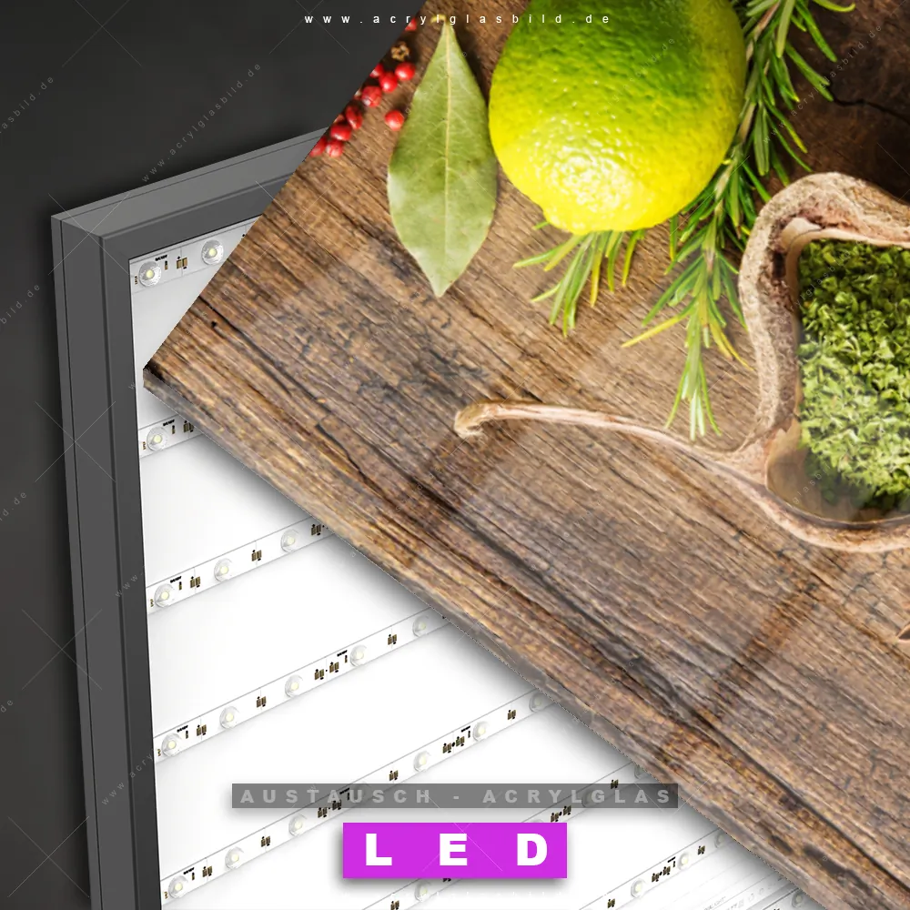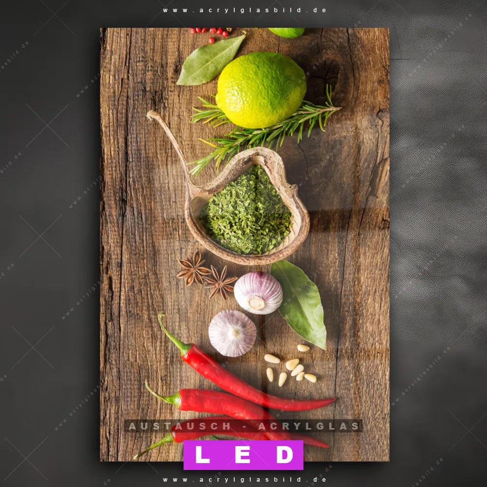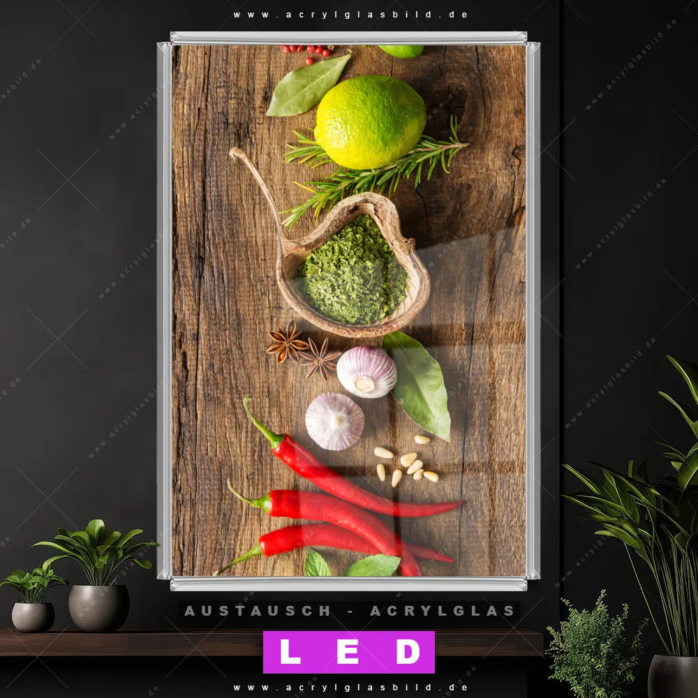Begriffe wie Gewürze, Kräuter, kochen, Chili, Pfeffer, Ingwer, Paprika, Holz, Knoblauch, Essen, Küche haben dich auf der Suche nach deinem neuen Austausch-Acrylglasbild inspiriert? Dann sollte das Wechsel-Acrylglasbild Reihe mit frischen Kräutern & Gewürzen für dein bereits vorhandenes LED Acrylglasbild Canvalight® DIA den Weg zu dir finden.