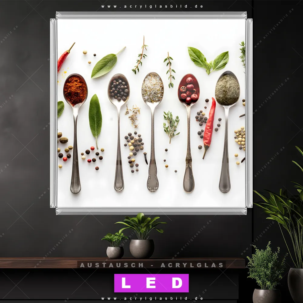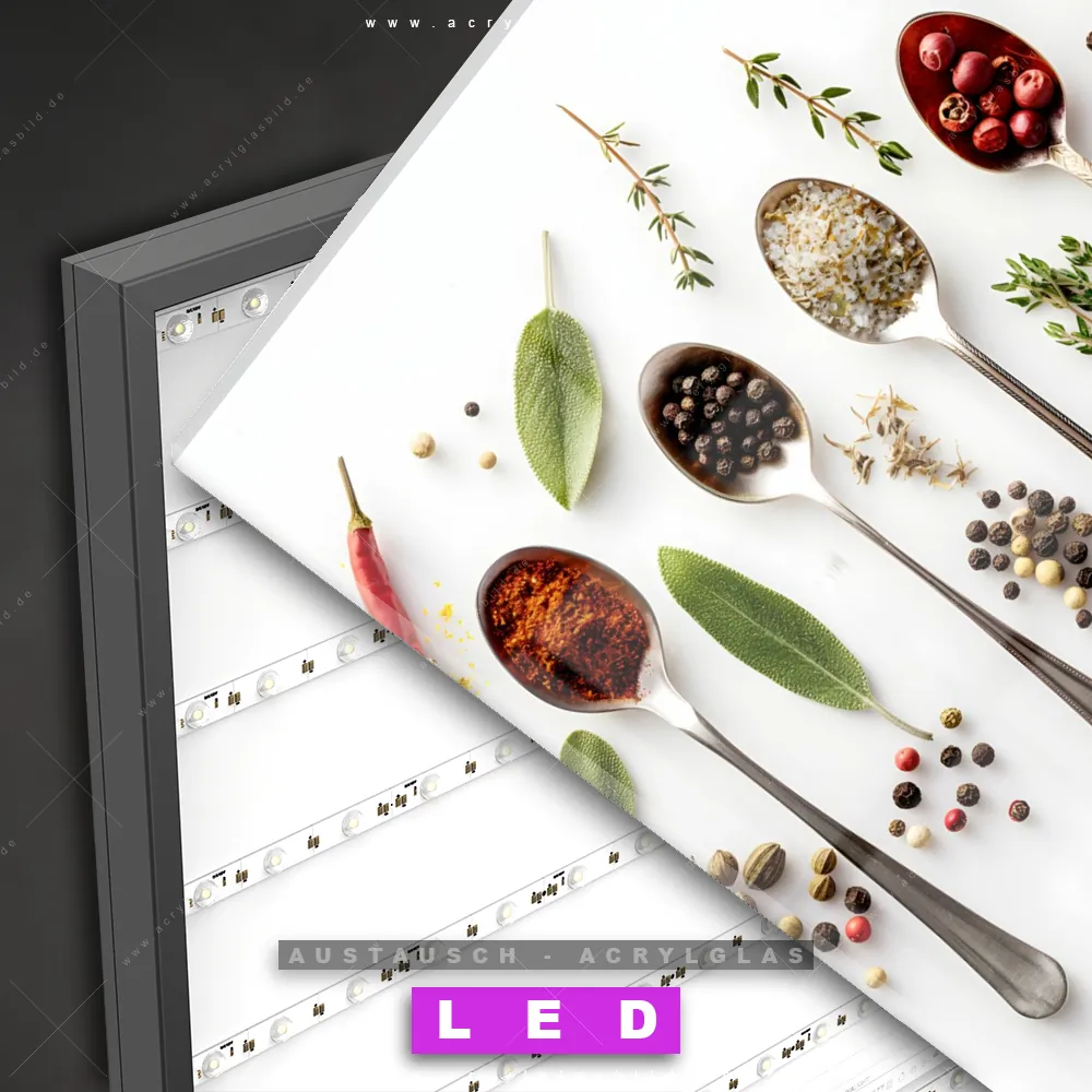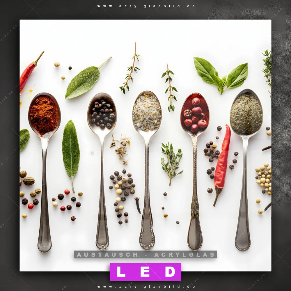 Begriffe wie Gewürze, Kräuter, Löffel, Besteck, Lebensmittel, Geschmack, kochen, Aromen haben dich auf der Suche nach deinem neuen Austausch-Acrylglasbild inspiriert? Dann sollte das Wechsel-Acrylglasbild Küchenkunst: Gewürze für dein bereits vorhandenes LED Acrylglasbild Canvalight® DIA den Weg zu dir finden.