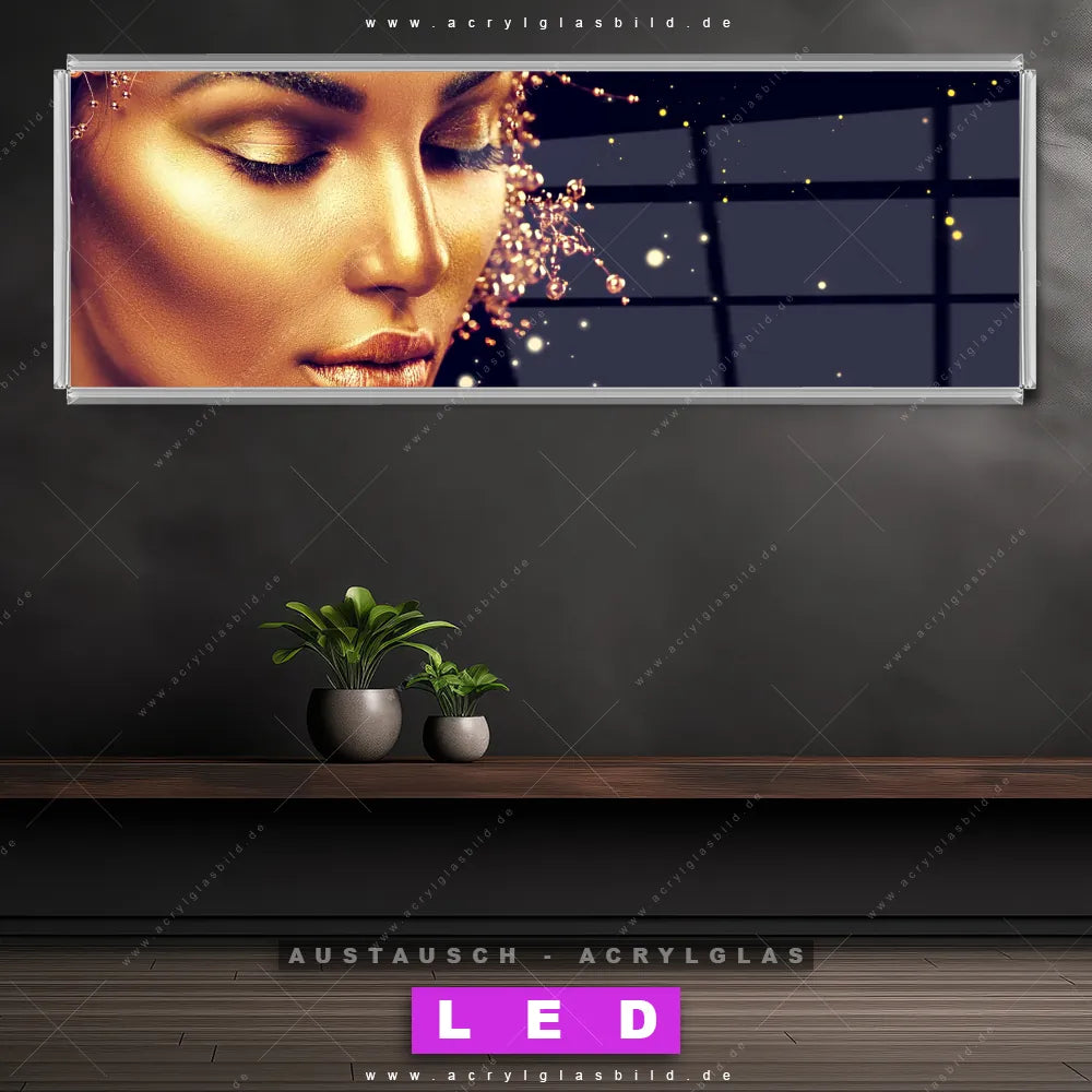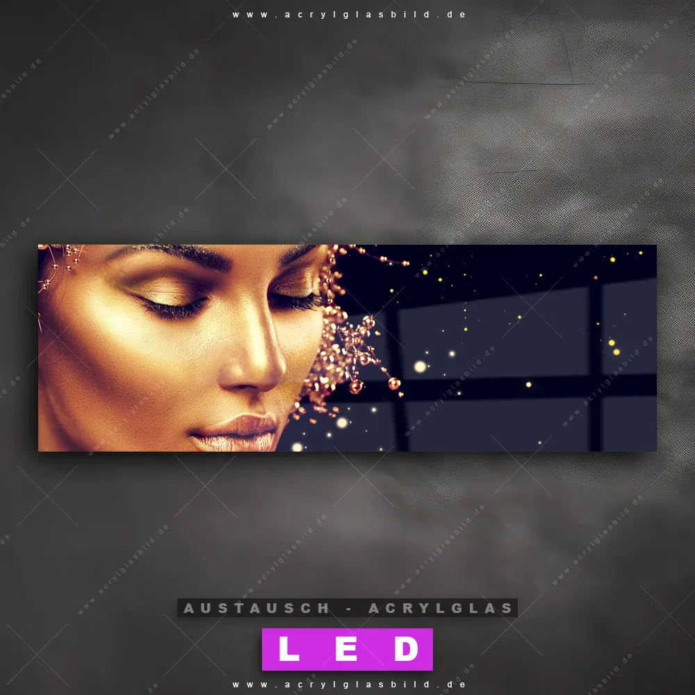 Begriffe wie Frau, Farbe, Beauty, Gesicht, Körper, Make-Up, Schminke, Mädchen, Glitzer, Glitter haben dich auf der Suche nach deinem neuen Austausch-Acrylglasbild inspiriert? Dann sollte das Wechsel-Acrylglasbild goldene Frau für dein bereits vorhandenes LED Acrylglasbild Canvalight® DIA den Weg zu dir finden.