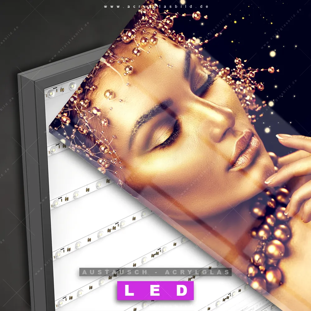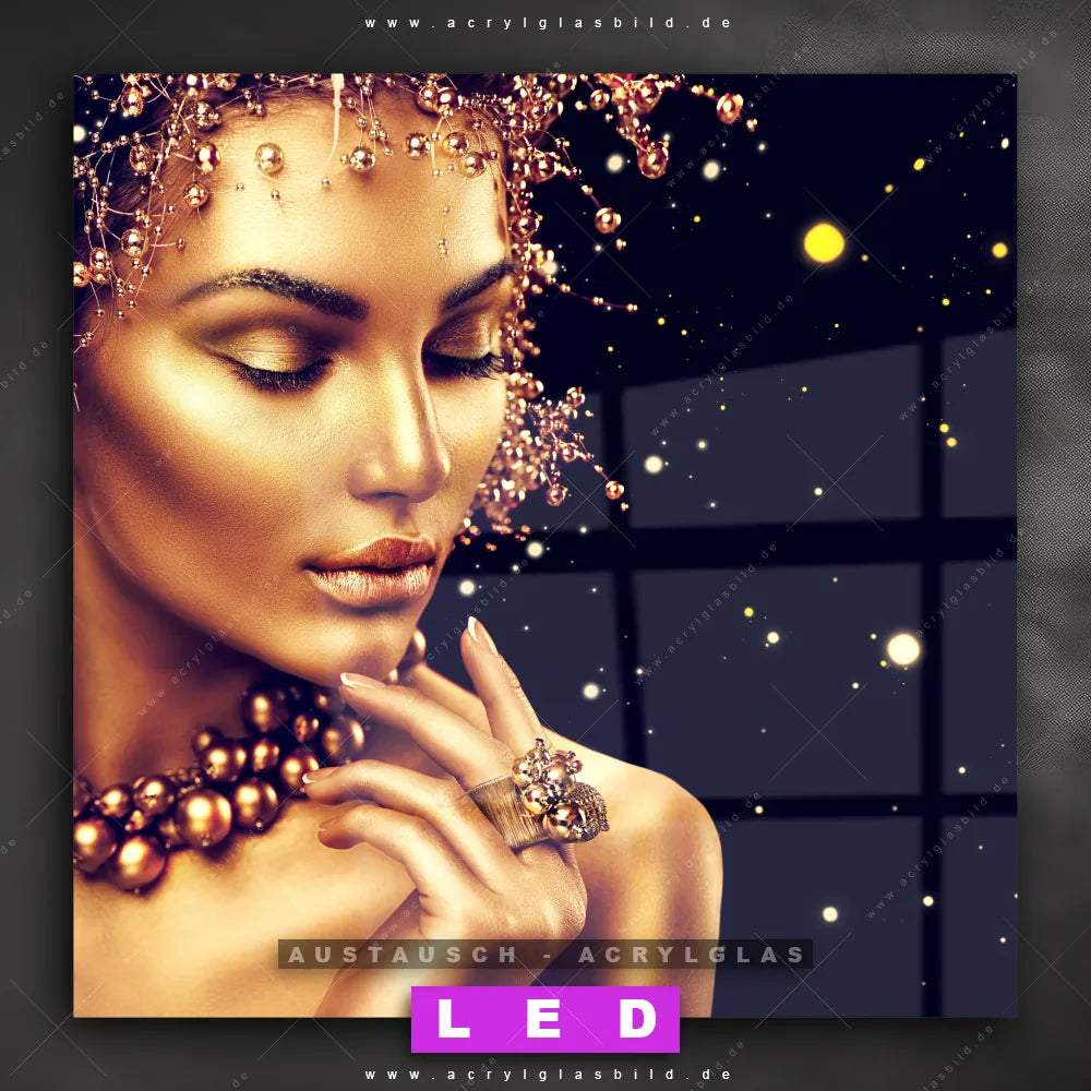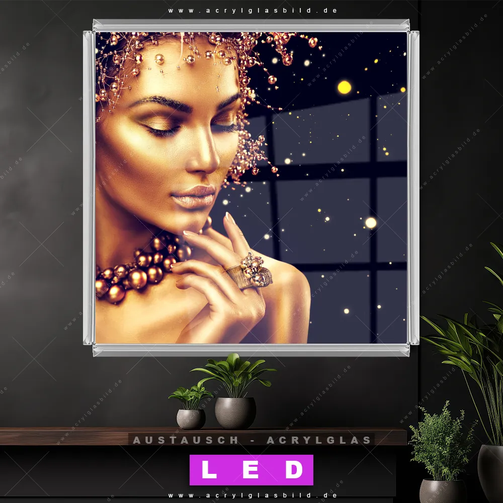 Begriffe wie Frau, Farbe, Beauty, Gesicht, Körper, Make-Up, Schminke, Mädchen, Glitzer, Glitter haben dich auf der Suche nach deinem neuen Austausch-Acrylglasbild inspiriert? Dann sollte das Wechsel-Acrylglasbild goldene Frau für dein bereits vorhandenes LED Acrylglasbild Canvalight® DIA den Weg zu dir finden.