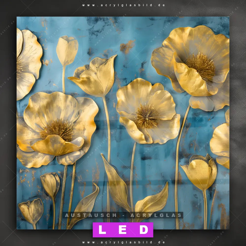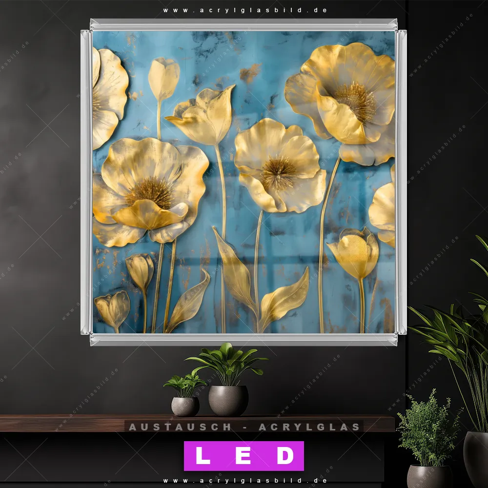 Wechsel-Acrylglas Canvalight® DIA | Goldene Blumen auf Blau | Quadrat