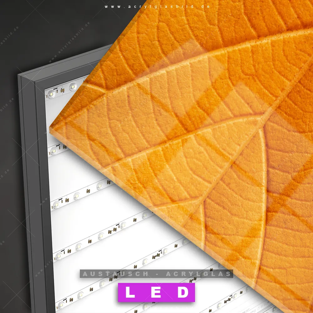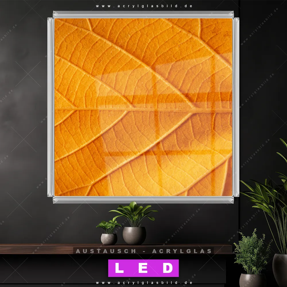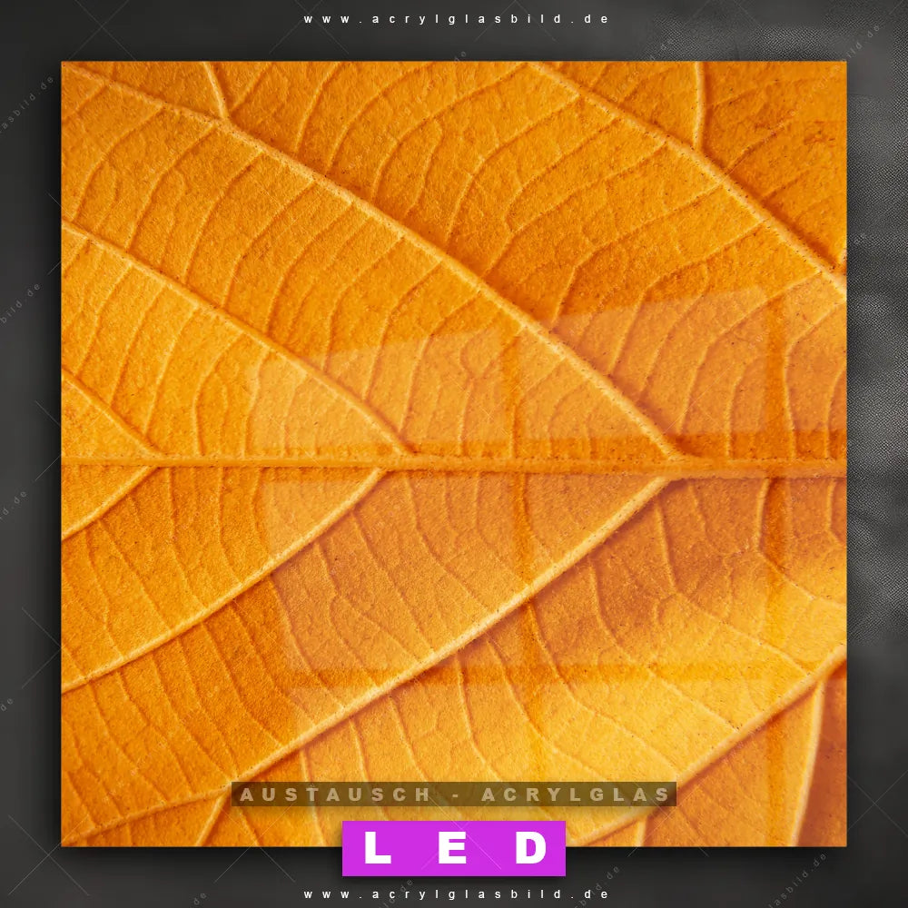 Begriffe wie Pflanze, Natur, Nahaufnahme, Vogelperspektive, Draufsicht, Blatt, Blätter haben dich auf der Suche nach deinem neuen Austausch-Acrylglasbild inspiriert? Dann sollte das Wechsel-Acrylglasbild Laubblatt in gold für dein bereits vorhandenes LED Acrylglasbild Canvalight® DIA den Weg zu dir finden.