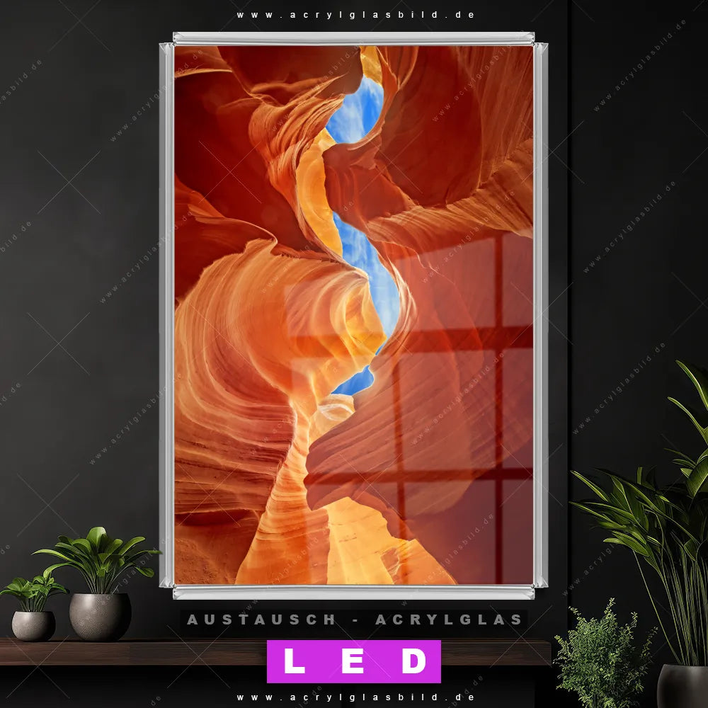 Begriffe wie Natur, Ruhe, Stille, Froschperspektive, Schlucht haben dich auf der Suche nach deinem neuen Austausch-Acrylglasbild inspiriert? Dann sollte das Wechsel-Acrylglasbild Schlucht mit Blick in den Himmel für dein bereits vorhandenes LED Acrylglasbild Canvalight® DIA den Weg zu dir finden.