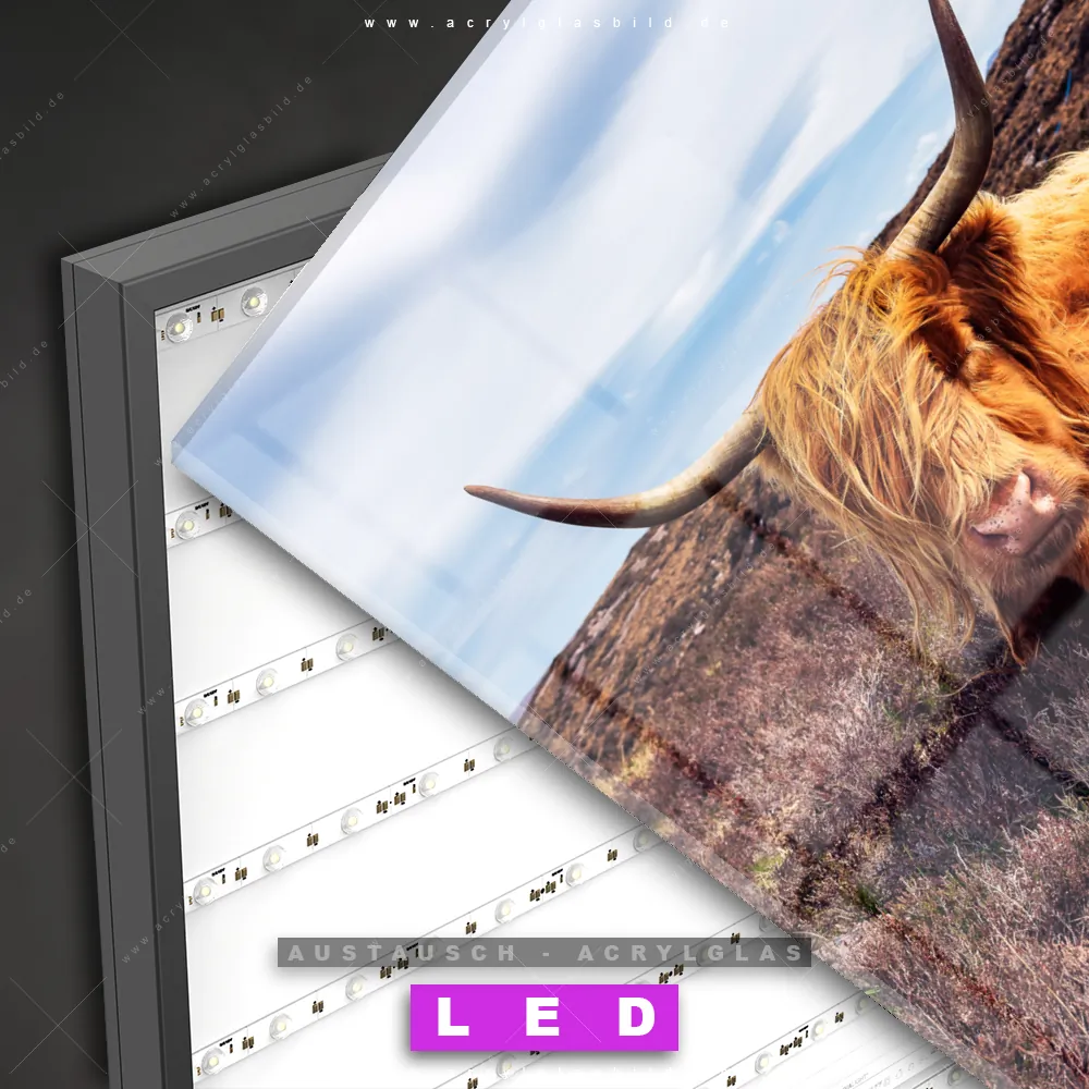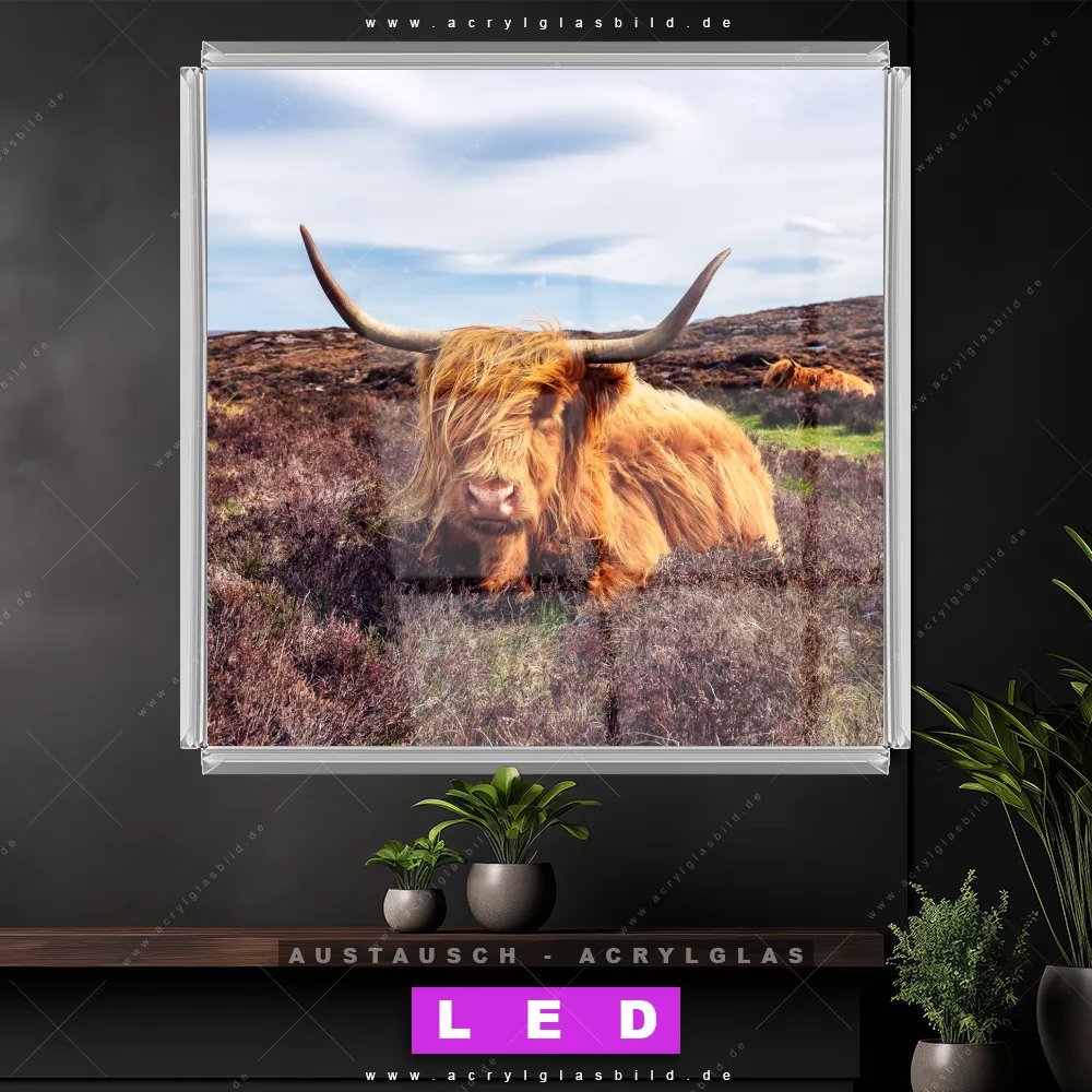 Begriffe wie Tier, Stier, Hochlandkuh, Highlander, Büffel, Rind, Bulle, Hochlandrind, Wiese, Weide, Hörner, Gras haben dich auf der Suche nach deinem neuen Austausch-Acrylglasbild inspiriert? Dann sollte das Wechsel-Acrylglasbild schottisches Hochlandrind auf Bergwiese für dein bereits vorhandenes LED Acrylglasbild Canvalight® DIA den Weg zu dir finden.